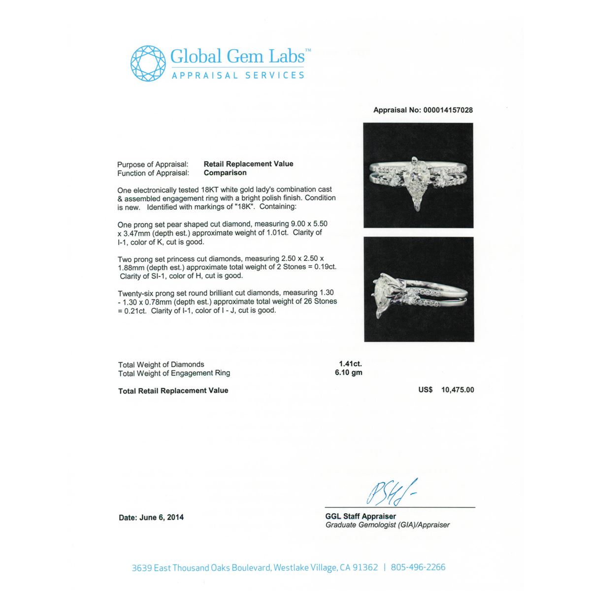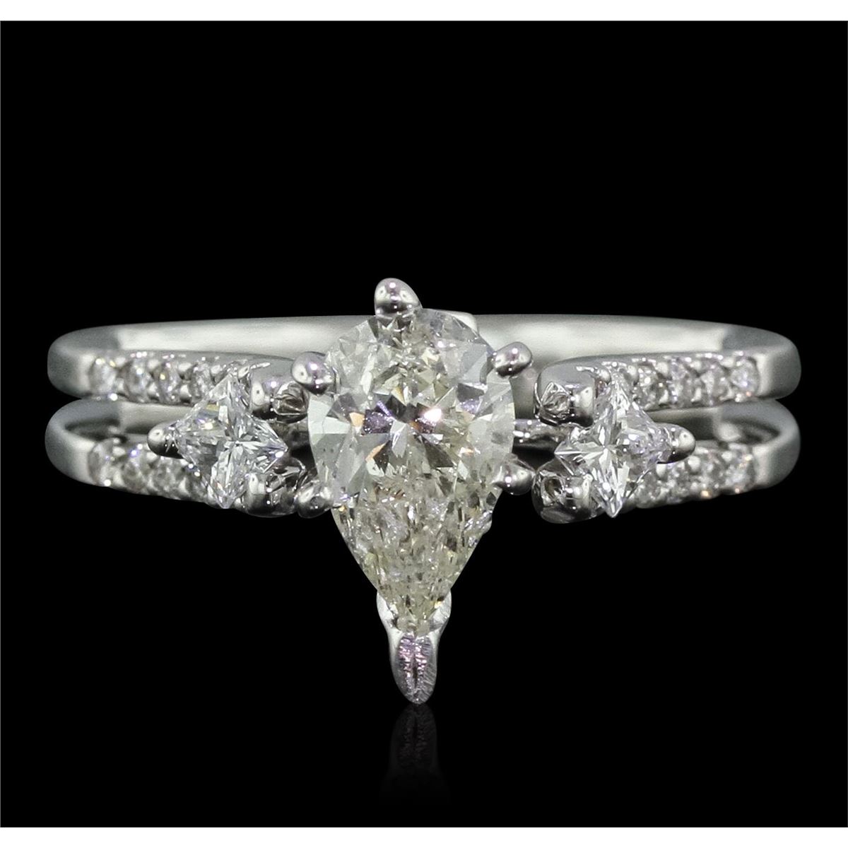 One electronically tested 18KT white gold Ladies combination cast & assembled engagement ring with a bright polish finish. Condition is new. Identified with markings of "18K". Containing: One prong set pear shaped cut diamond, measuring 9.00 x 5.50 x 3.47mm (depth est.) approximate weight of 1.01ct. Clarity: I-1. Color: K, Cut is Good. Two prong set princess cut diamonds, measuring 2.50 x 2.50 x 1.88mm (depth est.) approximate. Total Weight of 2 Stones = 0.19ct. Clarity: SI-1. Color: H, Cut is Good. Twenty-Six prong set round brilliant cut diamonds, measuring 1.30 - 1.30 x 0.78mm (depth est.) approximate. Total Weight of 26 Stones = 0.21ct. Clarity: I-1. Color: I - J, Cut is Good. Total Weight of Diamonds 1.41ct. Total Weight of Engagement Ring 6.10 grams. GGL Appraised at $10,475.00.