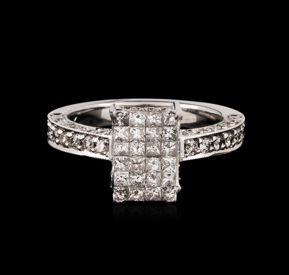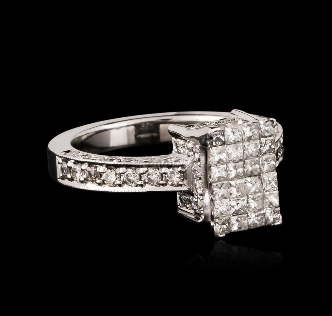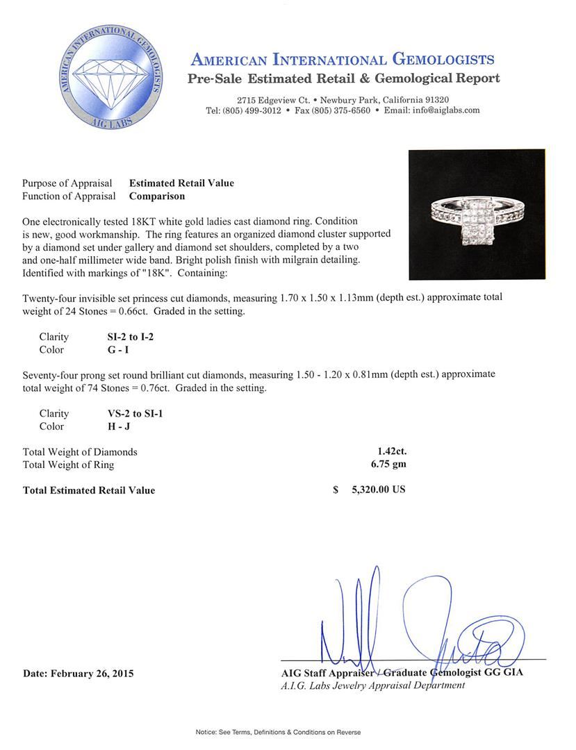 One electronically tested 18KT white gold ladies cast diamond ring. The ring features an organized diamond cluster supported by a diamond set under gallery and diamond set shoulders, completed by a two and one-half millimeter wide band. Bright polish finish with milgrain detailing. Identified with markings of "18K". Condition is new, good workmanship. Containing: Twenty-Four invisible set princess cut diamonds, measuring 1.70 x 1.50 x 1.13mm (depth est.) approximate total weight of 24 Stones = 0.66ct. Graded in the setting. Clarity: SI-2 to I-2. Color: G - I Seventy-Four prong set round brilliant cut diamonds, measuring 1.50 - 1.20 x 0.81mm (depth est.) approximate total weight of 74 Stones = 0.76ct. Graded in the setting. Clarity: VS-2 to SI-1. Color: H - J. Total Weight of Diamonds 1.42ct. Total Weight of Ring 6.75 grams. AIG Appraised at $5,320.00.