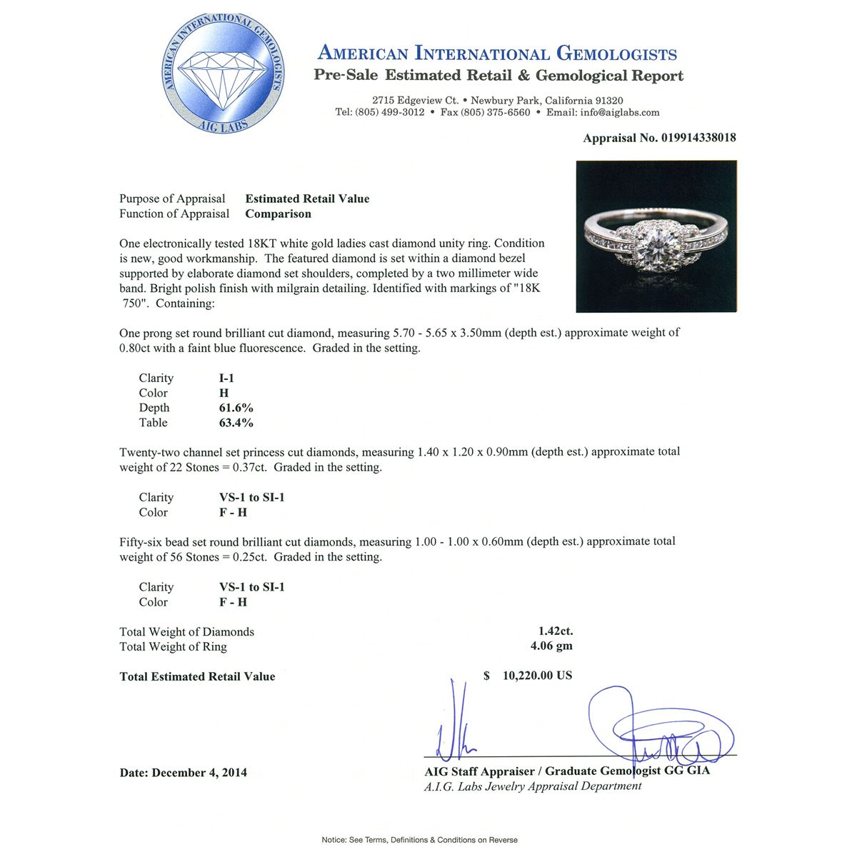 One electronically tested 18KT white gold ladies cast diamond unity ring. The featured diamond is set within a diamond bezel supported by elaborate diamond set shoulders, completed by a two millimeter wide band. Bright polish finish with milgrain detailing. Identified with markings of "18K 750". Condition is new, good workmanship. Containing: One prong set round brilliant cut diamond, measuring 5.70 - 5.65 x 3.50mm (depth est.) approximate weight of 0.80ct with a faint blue fluorescence. Graded in the setting. Clarity: I-1. Color: 61.6%. Table 63.4%. Twenty-Two channel set princess cut diamonds, measuring 1.40 x 1.20 x 0.90mm (depth est.) approximate total weight of 22 Stones = 0.37ct. Graded in the setting. Clarity: VS-1 to SI-1. Color: F - H Fifty-Six bead set round brilliant cut diamonds, measuring 1.00 - 1.00 x 0.60mm (depth est.) approximate total weight of 56 Stones = 0.25ct. Graded in the setting. Clarity: VS-1 to SI-1. Color: F - H. Total Weight of Diamonds 1.42ct. Total Weight of Ring 4.06 grams. AIG Appraised at $10,220.00.