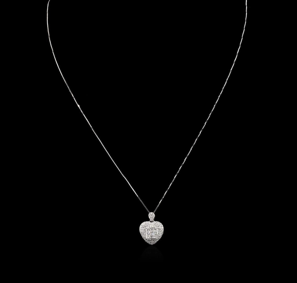 One electronically tested 18KT white gold ladies cast diamond pendant & chain 16.0" long, box link with a spring ring clasp with a bright polish finish. Measurements: 16" in length Identified with markings of "18K". Condition is new. Containing: Eighty prong set round brilliant cut diamonds, measuring 1.50 - 1.50 x 0.90mm (depth est.) approximate total weight of 80 Stones = 0.98ct. Clarity: SI-2 to I-1. Color: H - I, Cut is Good. Nine invisible set princess cut diamonds, measuring 2.00. x 2.00. x 1.50mm (depth est.) approximate total weight of 9 Stones = 0.44ct. Clarity: SI-1. Color: I - J. All diamonds are graded in the mounting, unless otherwise stated. Total Weight of Diamonds 1.43ct. Total Weight of Pendant & Chain 3.50 grams. GGL Appraised at $4,940.00.