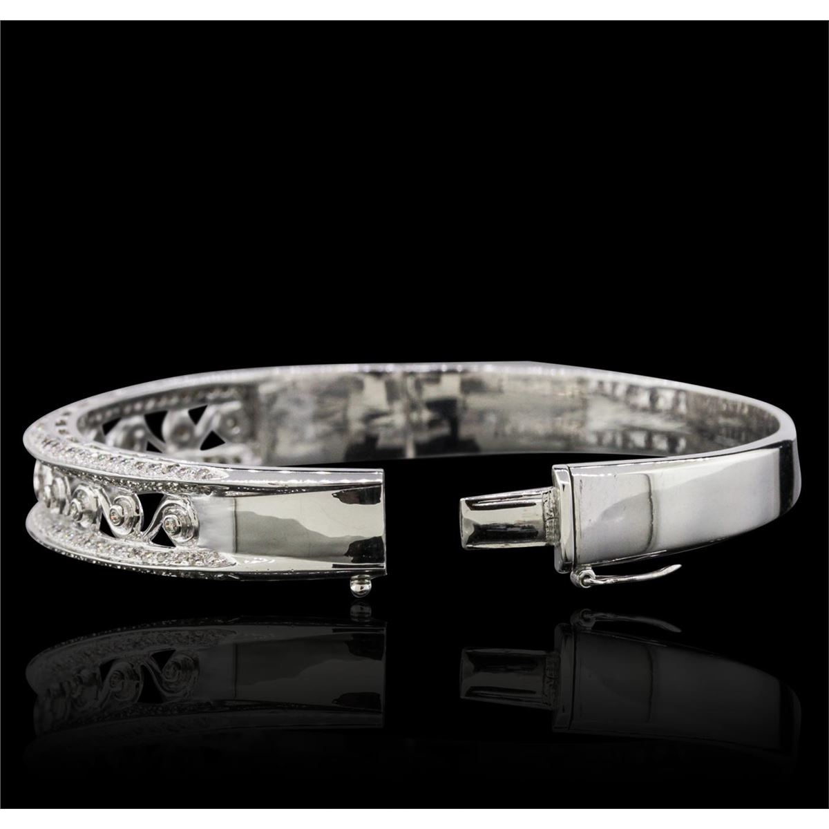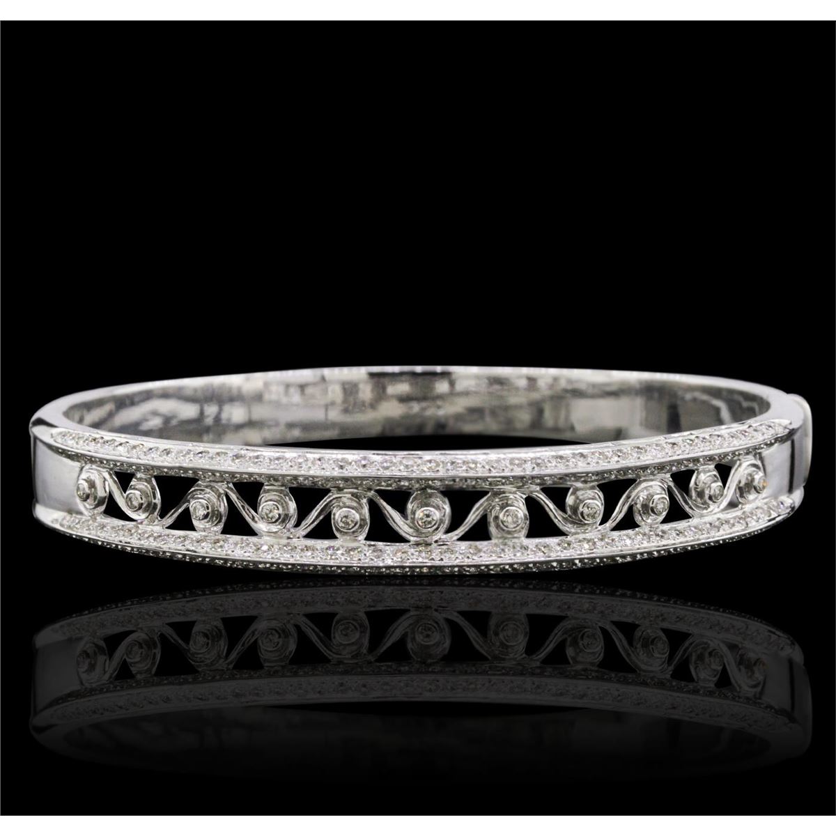One electronically tested 18KT white gold ladies combination cast & assembled bangle bracelet with a bright polish finish. Measurements: 2.5" x 2.2". Identified with markings of "750". Condition is new. Containing: One Hundred Sixty-Two prong set round brilliant cut diamonds, measuring 1.30 - 1.30 x 0.78mm (depth est.) approximate total weight of 162 Stones = 1.30ct. Clarity: SI-1 to SI-2. Color: J - K, Cut is Good. Eleven bezel set round brilliant cut diamonds, measuring 1.50 - 1.50 x 0.90mm (depth est.) approximate total weight of 11 Stones = 0.14ct. Clarity: SI-2. Color: J, Cut is Good. All diamonds are graded in the mounting, unless otherwise stated. Total Weight of Diamonds 1.43ct. Total Weight of Bracelet 34.90 grams. GGL Appraised at $9,215.00.