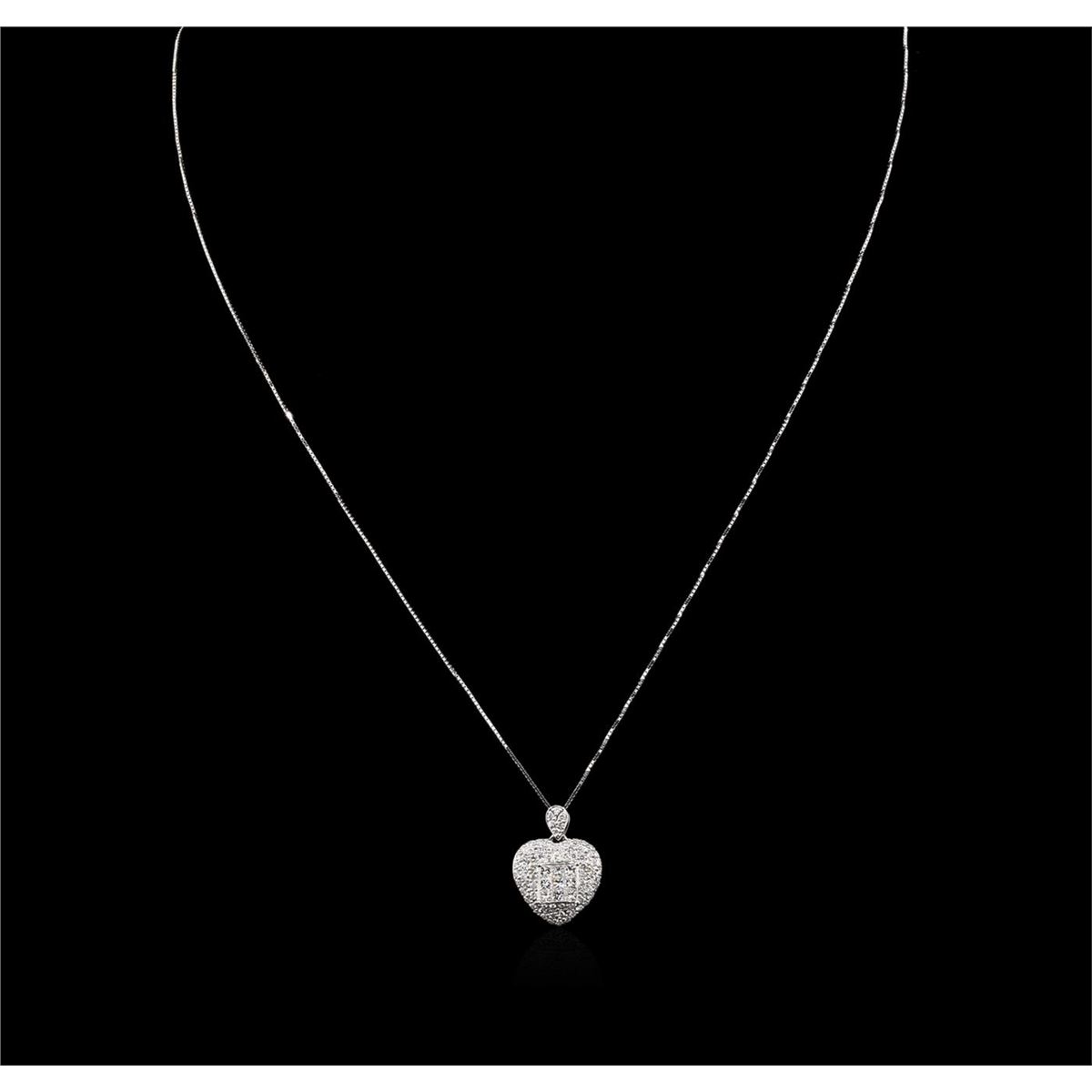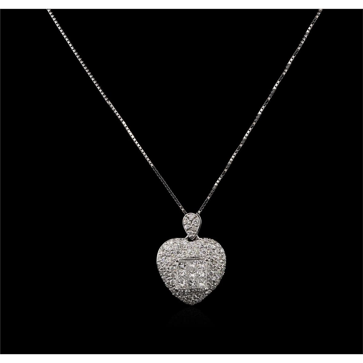 One electronically tested 18KT white gold ladies cast diamond pendant & chain 16.0" long, box link with a spring ring clasp with a bright polish finish. Measurements: 16" in length Identified with markings of "18K". Condition is new. Containing: Eighty prong set round brilliant cut diamonds, measuring 1.50 - 1.50 x 0.90mm (depth est.) approximate total weight of 80 Stones = 0.98ct. Clarity: SI-2 to I-1. Color: H - I, Cut is Good. Nine invisible set princess cut diamonds, measuring 2.00. x 2.00. x 1.50mm (depth est.) approximate total weight of 9 Stones = 0.44ct. Clarity: SI-1. Color: I - J. All diamonds are graded in the mounting, unless otherwise stated. Total Weight of Diamonds 1.43ct. Total Weight of Pendant & Chain 3.50 grams. GGL Appraised at $4,940.00.