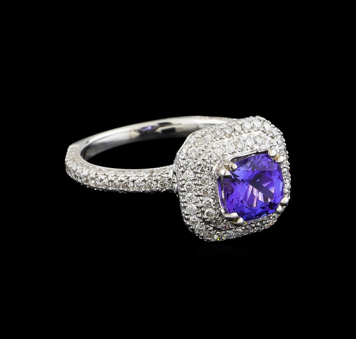 One electronically tested 18KT white gold ladies cast tanzanite and diamond ring. The featured tanzanite is set within a tiered diamond bezel supported by diamond set shoulders, completed by a two millimeter wide band. Bright polish finish with milgrain detailing. Trademark is HANA. Identified with markings of "18K". Condition is new, good workmanship. Containing: One prong set square cushion brilliant cut natural tanzanite, measuring 6.45 x 6.40 x 4.10mm, 8% bulge factor, approximate weight of 1.44ct., clarity is eye clean, type I, medium dark, very slightly grayish, bluish violet color, (GIA bV 6/3), cut is good. Transmitting light with no distortion, transparent. Graded in the setting. Tanzanite is a very rare gemstone that is only found in the country of Tanzania. Originally discovered in 1967. Tiffany & Company, named the stone Tanzanite. It is found in the Usumburu Mountains that border the Umba Valley of northern Tanzania. Tanzanite occurs in gray, brown, violet, blue, reddish-purple, & green. The gem is interesting because of its exceptional pleochroism. Rotated in different directions a tanzanite will exhibit multiple changes of color. Tanzanite has a low tolerance to ultrasonic cleaning, and should not be cleaned using this method. One Hundred Ninety-Four prong set round brilliant cut diamonds, measuring 1.20 - 1.10 x 0.69mm (depth est.) approximate total weight of 194 Stones = 1.08ct. Graded in the setting. Clarity: SI-2 to I-2. Color: H - J. Total Weight of Colored Stones 1.44ct. Total Weight of Diamonds 1.08ct. Total Weight of Ring 4.98 grams. AIG Appraised at $7,705.00.