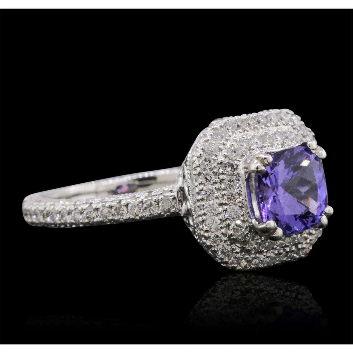 One electronically tested 18KT white gold ladies cast tanzanite and diamond ring. The featured tanzanite is set within a tiered diamond bezel supported by diamond set shoulders, completed by a two millimeter wide band. Bright polish finish with milgrain detailing. Trademark is HANA. Identified with markings of "18K". Condition is new, good workmanship. Containing: One prong set square cushion brilliant cut natural tanzanite, measuring 6.45 x 6.40 x 4.10mm, 8% bulge factor, approximate weight of 1.44ct., clarity is eye clean, type I, medium dark, very slightly grayish, bluish violet color, (GIA bV 6/3), cut is good. Transmitting light with no distortion, transparent. Graded in the setting. Tanzanite is a very rare gemstone that is only found in the country of Tanzania. Originally discovered in 1967. Tiffany & Company, named the stone Tanzanite. It is found in the Usumburu Mountains that border the Umba Valley of northern Tanzania. Tanzanite occurs in gray, brown, violet, blue, reddish-purple, & green. The gem is interesting because of its exceptional pleochroism. Rotated in different directions a tanzanite will exhibit multiple changes of color. Tanzanite has a low tolerance to ultrasonic cleaning, and should not be cleaned using this method. One Hundred Ninety-Four prong set round brilliant cut diamonds, measuring 1.20 - 1.10 x 0.69mm (depth est.) approximate total weight of 194 Stones = 1.08ct. Graded in the setting. Clarity: SI-2 to I-2. Color: H - J. Total Weight of Colored Stones 1.44ct. Total Weight of Diamonds 1.08ct. Total Weight of Ring 4.98 grams. AIG Appraised at $7,705.00.