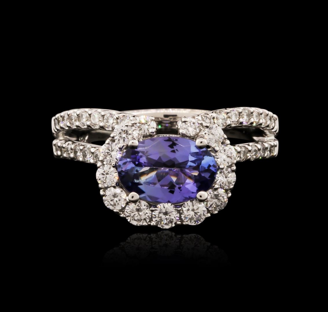 One electronically tested 18KT white gold ladies cast tanzanite and diamond ring with a bright polish finish. Identified with markings of "18K". Condition is new. Containing: One prong set oval modified brilliant cut natural tanzanite, measuring 8.80 x 6.00 x 3.90mm, approximate weight of 1.45ct., clarity is eye clean, type I, medium light, very slightly grayish, violet color, (GIA V 4/3), cut is good. Fifty prong set round brilliant cut diamonds, measuring 2.00 - 1.30 x 0.99mm (depth est.) approximate total weight of 50 Stones = 0.82ct. Clarity: SI-1 to I-1. Color: I - J, Cut is Good. Colored gemstones are presumed to have been subjected to commonly used enhancement processes, All diamonds and colored gemstones are graded in the mounting, unless otherwise stated. Total Weight of Colored Stones 1.45ct. Total Weight of Diamonds 0.82ct. Total Weight of Ring 5.20 grams. GGL Appraised at $3,790.00.