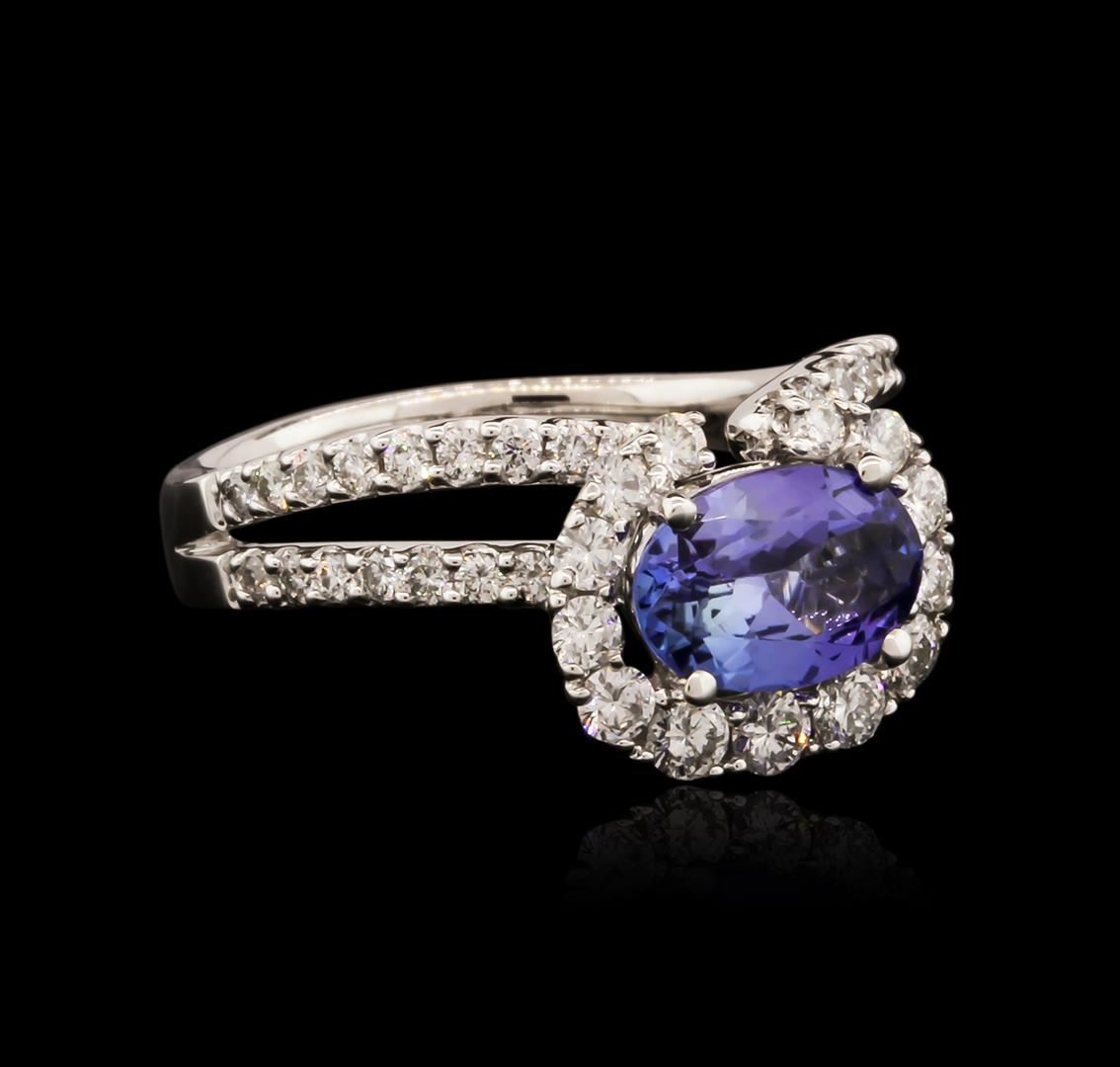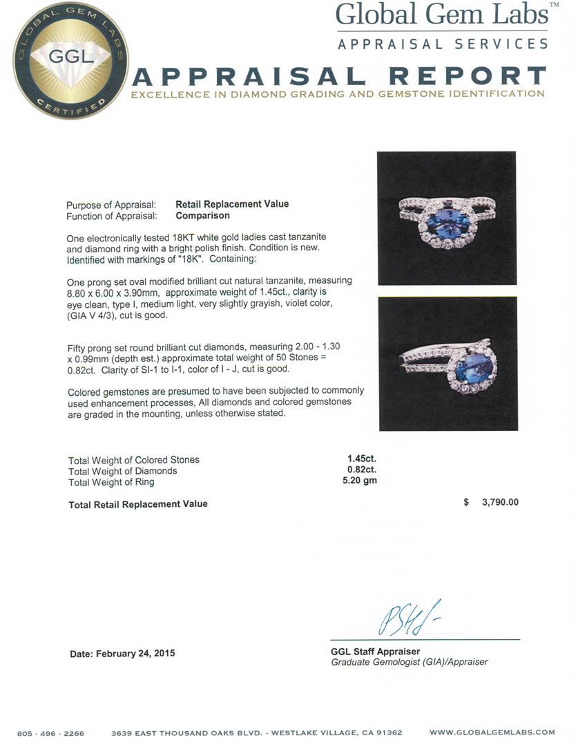 One electronically tested 18KT white gold ladies cast tanzanite and diamond ring with a bright polish finish. Identified with markings of "18K". Condition is new. Containing: One prong set oval modified brilliant cut natural tanzanite, measuring 8.80 x 6.00 x 3.90mm, approximate weight of 1.45ct., clarity is eye clean, type I, medium light, very slightly grayish, violet color, (GIA V 4/3), cut is good. Fifty prong set round brilliant cut diamonds, measuring 2.00 - 1.30 x 0.99mm (depth est.) approximate total weight of 50 Stones = 0.82ct. Clarity: SI-1 to I-1. Color: I - J, Cut is Good. Colored gemstones are presumed to have been subjected to commonly used enhancement processes, All diamonds and colored gemstones are graded in the mounting, unless otherwise stated. Total Weight of Colored Stones 1.45ct. Total Weight of Diamonds 0.82ct. Total Weight of Ring 5.20 grams. GGL Appraised at $3,790.00.
