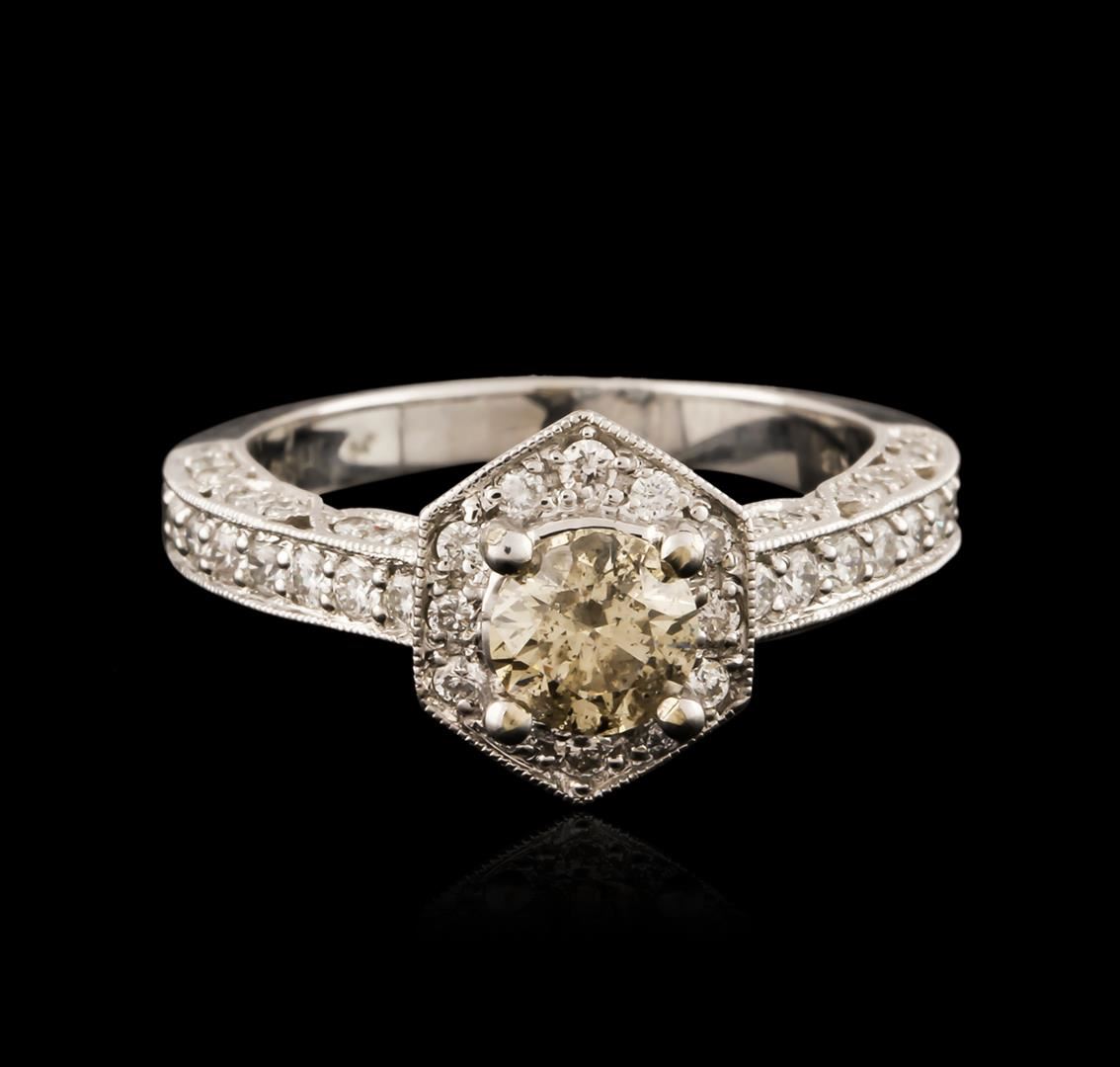 One electronically tested 18KT white gold ladies cast diamond engagement ring with a bright polish finish. Identified with markings of "18K". Condition is new. Containing: One prong set round brilliant cut diamond, measuring 5.50 - 5.50 x 3.30mm (depth est.) approximate weight of 0.61ct. Clarity: I-2, Cut is Good. Seventy-Six prong set round brilliant cut diamonds, measuring 1.70 - 1.20 x 0.87mm (depth est.) approximate total weight of 76 Stones = 0.84ct. Clarity: SI-2 to I-1. Color: H - I, Cut is Good. All diamonds are graded in the mounting, unless otherwise stated. Total Weight of Diamonds 1.45ct. Total Weight of Engagement Ring 5.80 grams. GGL Appraised at $4,430.00.