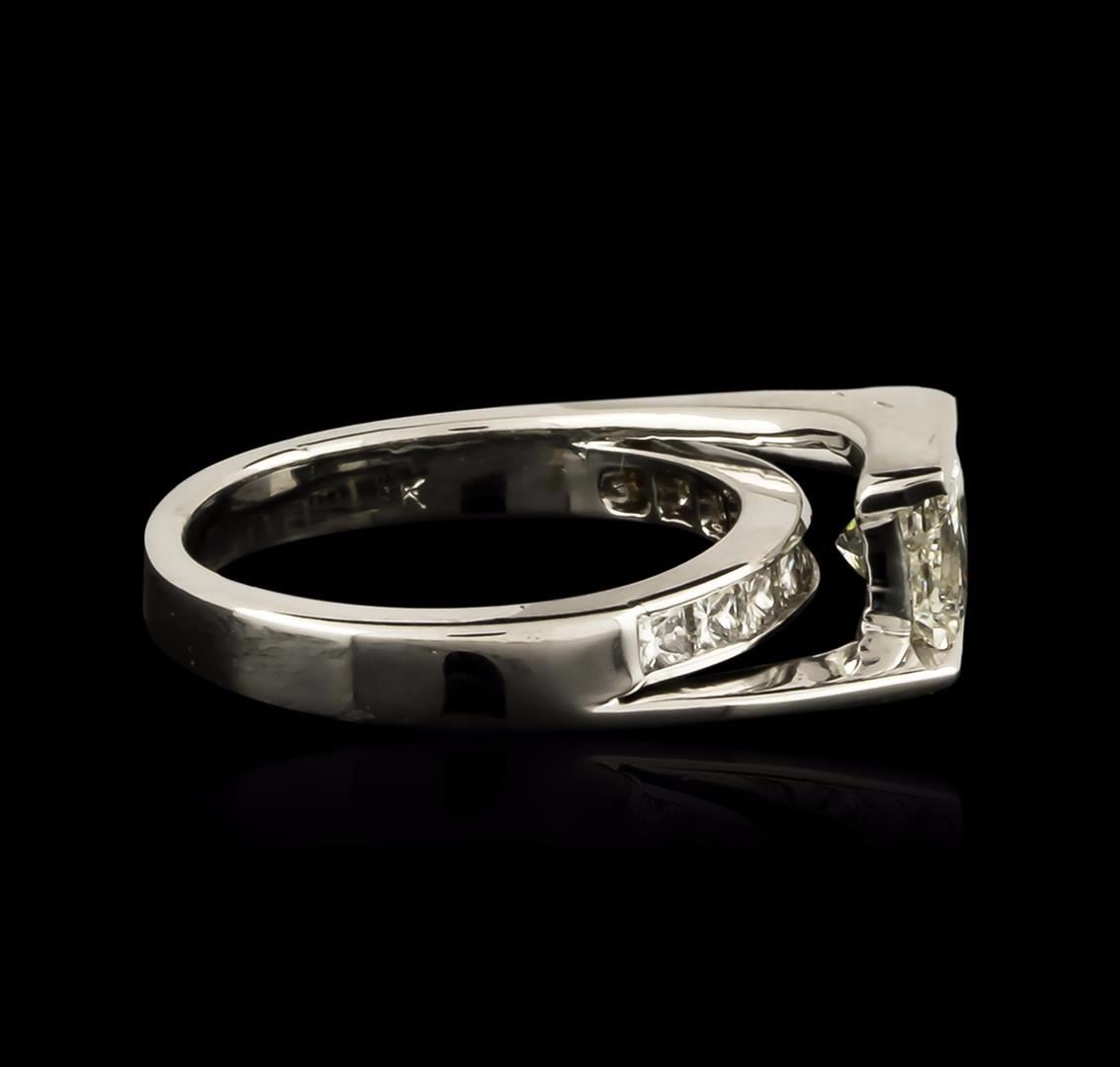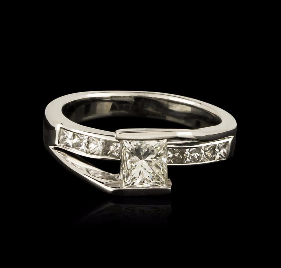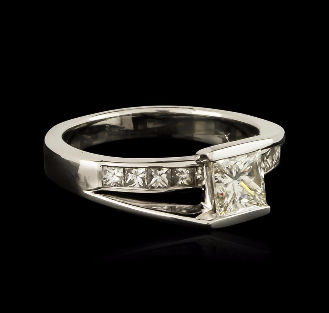 One electronically tested 18KT white gold ladies cast diamond unity ring with a bright polish finish. The featured diamond is cathedral set above a diamond ribbon, completed by a two and one-half millimeter wide band. Identified with markings of "18K". Condition is good. Containing: One channel set princess cut diamond, measuring 5.10 x 4.35 x 3.80mm (depth est.), 8.00.%. GTCF approximate weight of 0.84ct with a faint blue fluorescence. Graded in the setting. Clarity: I-1. Color: K. Depth 87.4%. Table 80.5%. Ten channel set princess cut diamonds, measuring 2.10 x 2.00 x 1.50mm (depth est.) approximate total weight of 10 Stones = 0.61ct. Graded in the setting. Clarity: VS-2 to SI-1. Color: H - J. Total Weight of Diamonds 1.45ct. Total Weight of Ring 4.99 grams. AIG Appraised at $5,845.00.