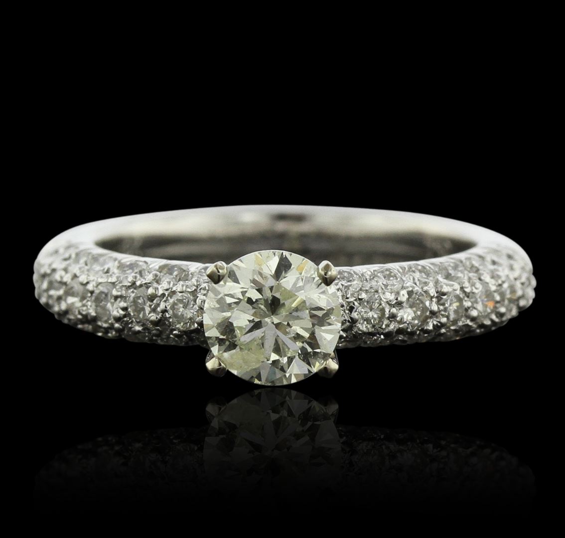 One electronically tested 18KT white gold ladies cast diamond unity ring with a bright polish finish. Condition is new, good workmanship. The featured diamond is supported by diamond set shoulders and completed by a three millimeter wide band. Identified with markings of "18K 750". Containing: One prong set round brilliant cut diamond, measuring 5.70 - 5.65 x 3.41mm (depth est.) approximate weight of 0.77ct. Graded in the setting. Clarity: I-1 Four pav, set round brilliant cut diamonds, measuring 1.10 - 1.00 x 0.63mm (depth est.) approximate. Total Weight of 4 Stones = 0.02ct. Graded in the setting. Clarity: VS-1 to SI-1 . Color: G - I Fourteen pav, set round brilliant cut diamonds, measuring 1.70 - 1.70 x 1.02mm (depth est.) approximate. Total Weight of 14 Stones = 0.30ct. Graded in the setting. Clarity: SI-1 to I-1 . Color: G - I Twenty-Eight pav, set round brilliant cut diamonds, measuring 1.40 - 1.40 x 0.84mm (depth est.) approximate. Total Weight of 28 Stones = 0.38ct. Graded in the setting. Clarity: SI-1 to I-1 . Color: G - I. Total Weight of Diamonds 1.47ct.. Total Weight of Ring 3.90 grams. AIG Appraised at $6,700.00.