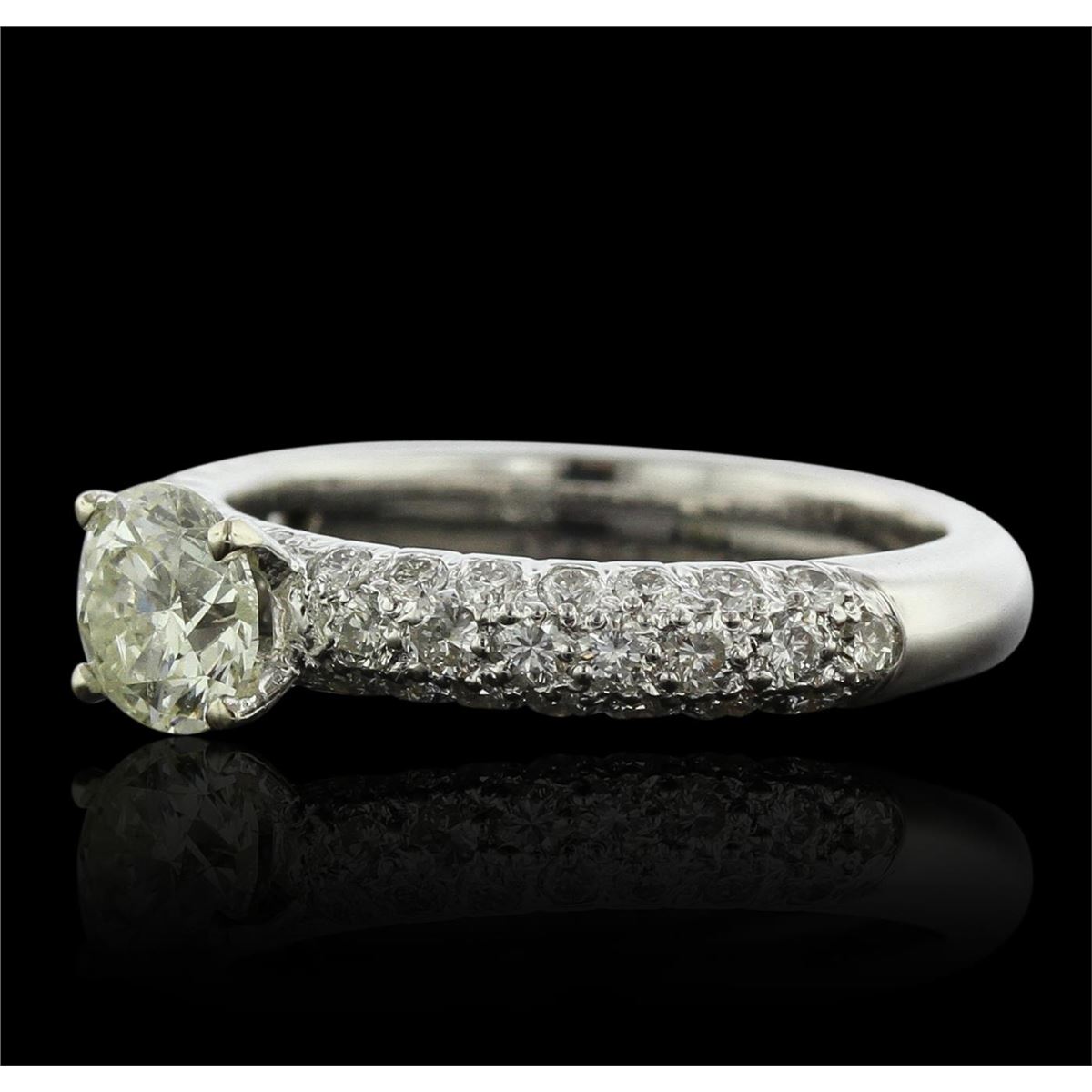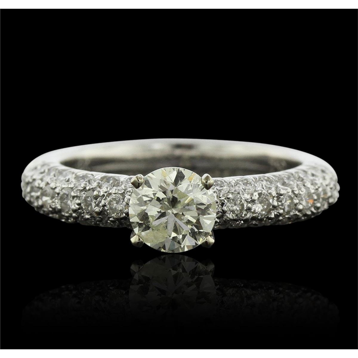One electronically tested 18KT white gold ladies cast diamond unity ring with a bright polish finish. Condition is new, good workmanship. The featured diamond is supported by diamond set shoulders and completed by a three millimeter wide band. Identified with markings of "18K 750". Containing: One prong set round brilliant cut diamond, measuring 5.70 - 5.65 x 3.41mm (depth est.) approximate weight of 0.77ct. Graded in the setting. Clarity: I-1 Four pav, set round brilliant cut diamonds, measuring 1.10 - 1.00 x 0.63mm (depth est.) approximate. Total Weight of 4 Stones = 0.02ct. Graded in the setting. Clarity: VS-1 to SI-1 . Color: G - I Fourteen pav, set round brilliant cut diamonds, measuring 1.70 - 1.70 x 1.02mm (depth est.) approximate. Total Weight of 14 Stones = 0.30ct. Graded in the setting. Clarity: SI-1 to I-1 . Color: G - I Twenty-Eight pav, set round brilliant cut diamonds, measuring 1.40 - 1.40 x 0.84mm (depth est.) approximate. Total Weight of 28 Stones = 0.38ct. Graded in the setting. Clarity: SI-1 to I-1 . Color: G - I. Total Weight of Diamonds 1.47ct.. Total Weight of Ring 3.90 grams. AIG Appraised at $6,700.00.