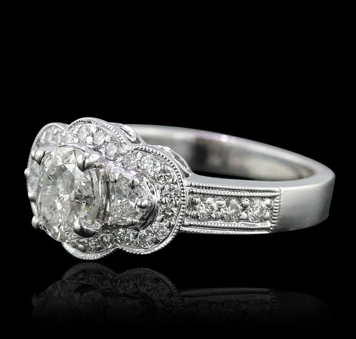 One electronically tested 18KT white gold Ladies combination cast & assembled engagement ring with a bright polish finish. Condition is new. Identified with markings of "18K". Containing: One prong set oval shaped cut diamond, measuring 7.00 x 5.30 x 3.34mm (depth est.) approximate weight of 0.78ct. Clarity: I-2. Color: I, Cut is Good. Thirty prong set round brilliant cut diamonds, measuring 1.50 - 1.30 x 0.84mm (depth est.) approximate total weight of 30 Stones = 0.30ct. Clarity: SI-1 to SI-2. Color: H - I, Cut is Good. Two prong set half moon cut diamonds, measuring 3.00 x 2.00 x 0.00mm (depth est.) approximate total weight of 2 Stones = 0.40ct. Clarity: SI-1. Color: G, Cut is Good. All diamonds are graded in the mounting, unless otherwise stated. Total Weight of Diamonds 1.48ct. Total Weight of Engagement Ring 6.80 grams. GGL Appraised at $7,930.00.