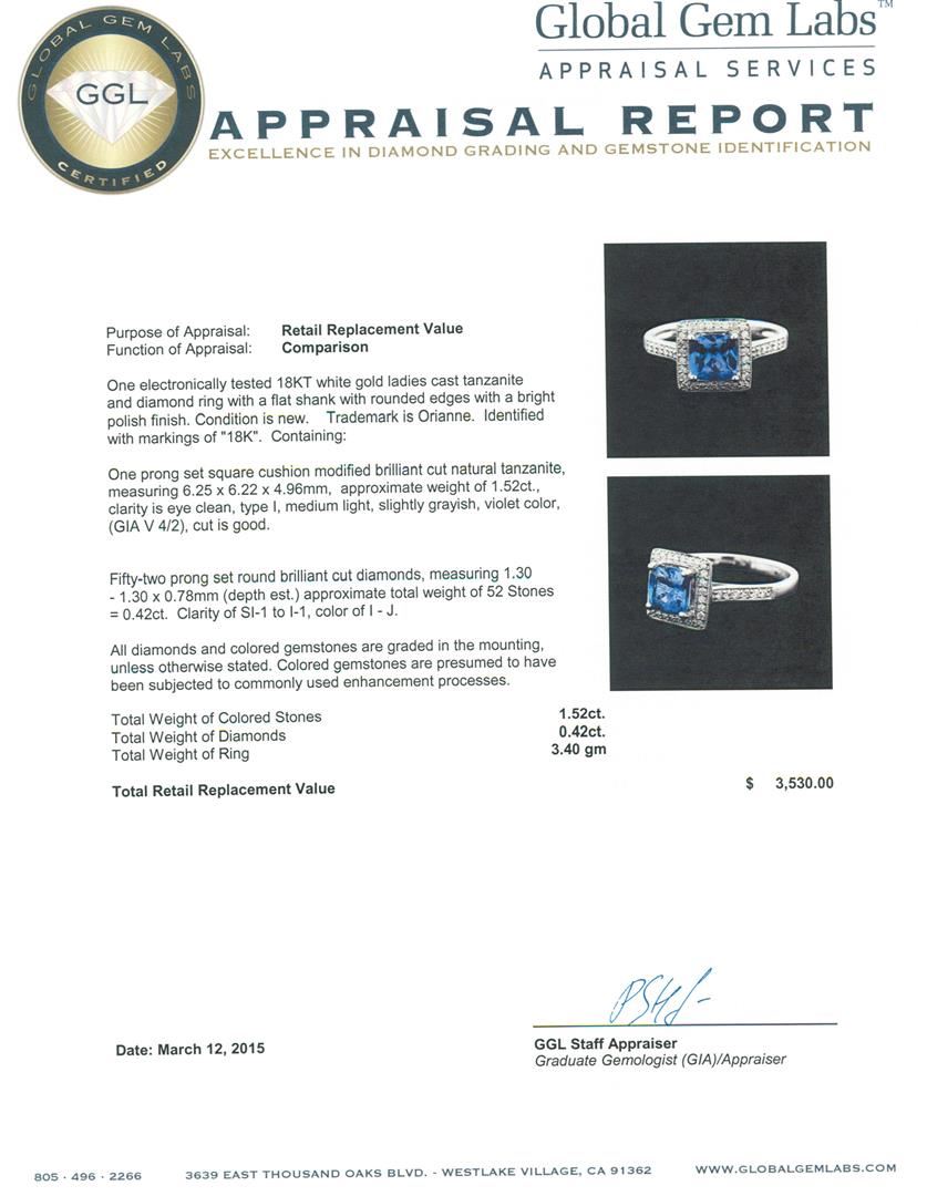 One electronically tested 18KT white gold ladies cast tanzanite and diamond ring with a flat shank with rounded edges with a bright polish finish. Trademark is Orianne. Identified with markings of "18K". Condition is new. Containing: One prong set square cushion modified brilliant cut natural tanzanite, measuring 6.25 x 6.22 x 4.96mm, approximate weight of 1.52ct., clarity is eye clean, type I, medium light, slightly grayish, violet color, (GIA V 4/2), cut is good. Fifty-Two prong set round brilliant cut diamonds, measuring 1.30 - 1.30 x 0.78mm (depth est.) approximate total weight of 52 Stones = 0.42ct. Clarity: SI-1 to I-1. Color: I - J. All diamonds and colored gemstones are graded in the mounting, unless otherwise stated. Colored gemstones are presumed to have been subjected to commonly used enhancement processes. Total Weight of Colored Stones 1.52ct. Total Weight of Diamonds 0.42ct. Total Weight of Ring 3.40 grams. GGL Appraised at $3,530.00.