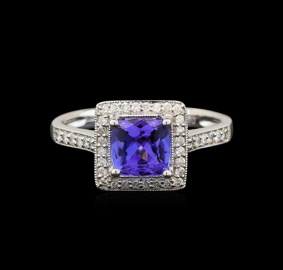 One electronically tested 18KT white gold ladies cast tanzanite and diamond ring with a flat shank with rounded edges with a bright polish finish. Trademark is Orianne. Identified with markings of "18K". Condition is new. Containing: One prong set square cushion modified brilliant cut natural tanzanite, measuring 6.25 x 6.22 x 4.96mm, approximate weight of 1.52ct., clarity is eye clean, type I, medium light, slightly grayish, violet color, (GIA V 4/2), cut is good. Fifty-Two prong set round brilliant cut diamonds, measuring 1.30 - 1.30 x 0.78mm (depth est.) approximate total weight of 52 Stones = 0.42ct. Clarity: SI-1 to I-1. Color: I - J. All diamonds and colored gemstones are graded in the mounting, unless otherwise stated. Colored gemstones are presumed to have been subjected to commonly used enhancement processes. Total Weight of Colored Stones 1.52ct. Total Weight of Diamonds 0.42ct. Total Weight of Ring 3.40 grams. GGL Appraised at $3,530.00.