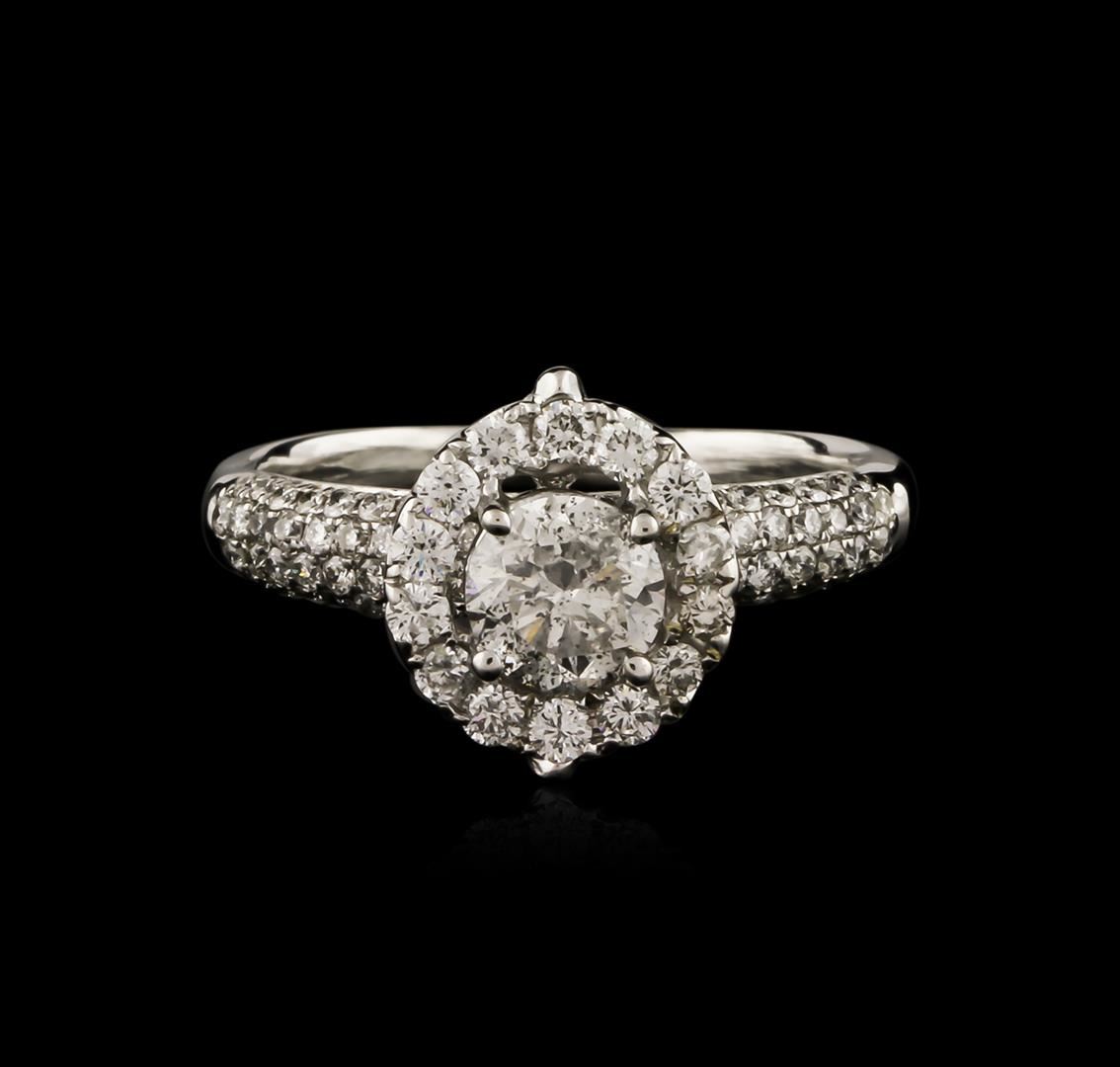 One electronically tested 18KT white gold ladies cast diamond engagement ring with a bright polish finish. Identified with markings of "18K". Condition is new. Containing: One prong set round brilliant cut diamond, measuring 5.60 - 5.50 x 3.33mm (depth est.) approximate weight of 0.63ct. Clarity: I-2. Color: J, Cut is Good. Eighty-One prong set round brilliant cut diamonds, measuring 1.70 - 1.20 x 0.87mm (depth est.) approximate total weight of 81 Stones = 0.90ct. Clarity: SI-1 to I-1. Color: I - J, Cut is Good. All diamonds are graded in the mounting, unless otherwise stated. Total Weight of Diamonds 1.53ct. Total Weight of Engagement Ring 4.10 grams. GGL Appraised at $4,375.00.