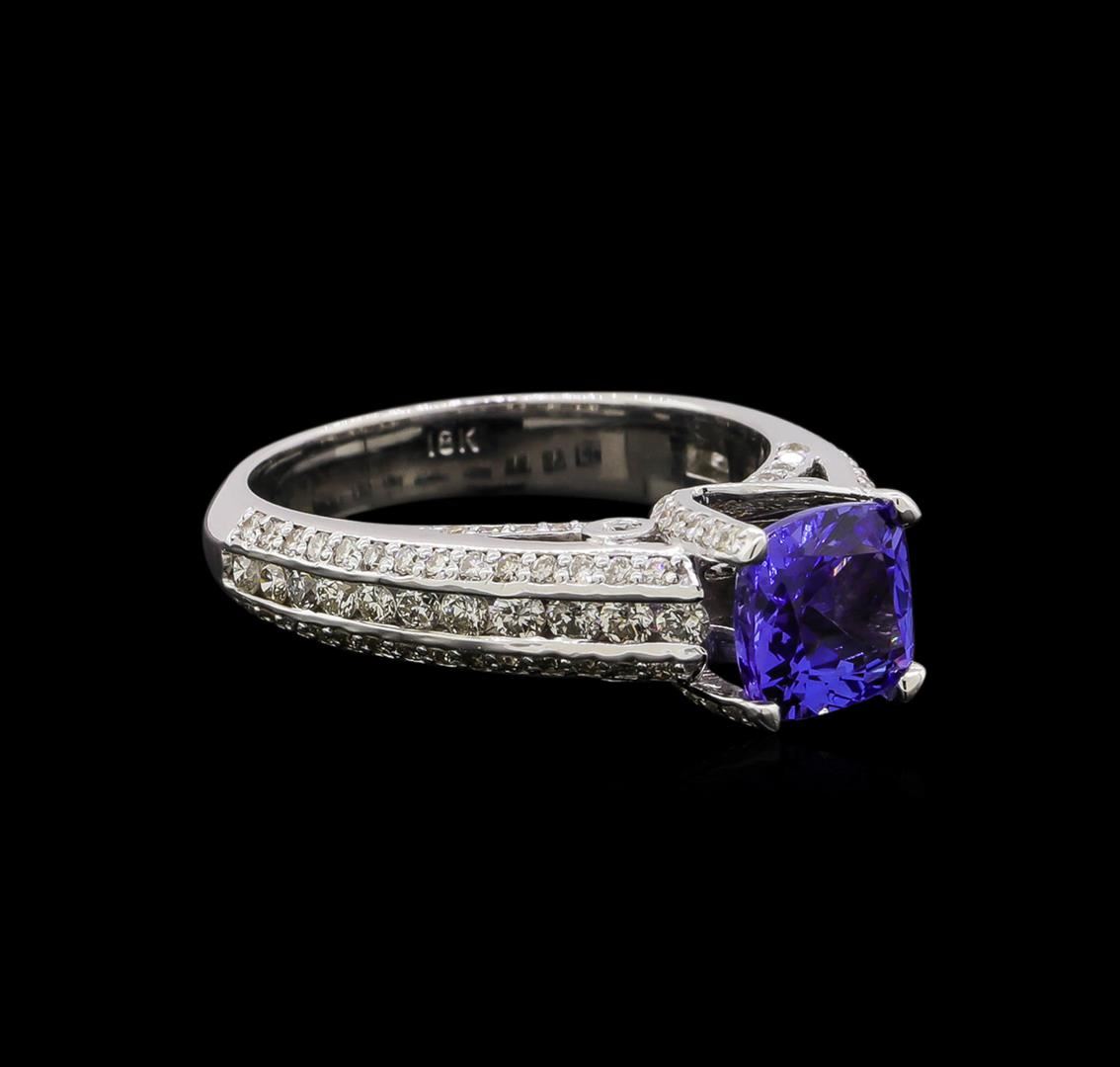 One electronically tested 18KT white gold ladies cast tanzanite and diamond ring with a bright polish finish. Identified with markings of "18K". Condition is new. Containing: One prong set square cushion modified brilliant cut natural tanzanite, measuring 6.70 x 6.67 x 4.35mm, approximate weight of 1.53ct., clarity is eye clean, type I, medium light, very slightly grayish, violet color, (GIA V 4/3), cut is very good. One Hundred Ten prong set round brilliant cut diamonds, measuring 1.10 - 1.10 x 0.66mm (depth est.) approximate total weight of 110 Stones = 0.53ct. Clarity: SI-2 to I-1. Color: J - K, Cut is Good. Twenty-Two channel set round brilliant cut diamonds, measuring 1.60 - 1.60 x 0.96mm (depth est.) approximate total weight of 22 Stones = 0.33ct. Clarity: SI-2. Color: J - K, Cut is Good. Colored gemstones are presumed to have been subjected to commonly used enhancement processes. All diamonds and colored gemstones are graded in the mounting, unless otherwise stated. Total Weight of Colored Stones 1.53ct. Total Weight of Diamonds 0.86ct. Total Weight of Ring 6.20 grams. GGL Appraised at $4,880.00.