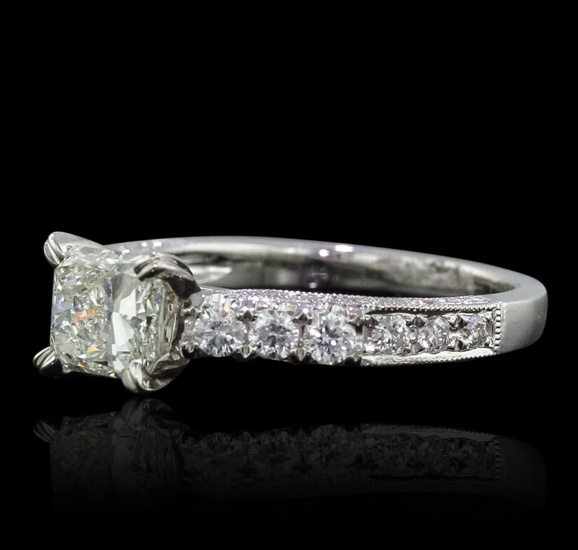 One electronically tested 18KT white gold Ladies combination cast & assembled engagement ring with a bright polish finish. Condition is new. Identified with markings of "750". Containing: One prong set radiant shaped cut diamond, measuring 6.07 x 5.40 x 3.80mm (depth est.) approximate weight of 1.02ct. Clarity: VS-2. Color: K, Cut is Very Good. Six prong set round brilliant cut diamonds, measuring 2.20 - 2.20 x 1.32mm (depth est.) approximate. Total Weight of 6 Stones = 0.23ct. Clarity: SI-2. Color: I - J, Cut is Good. Thirty bead set round brilliant cut diamonds, measuring 1.50 - 1.30 x 0.84mm (depth est.) approximate. Total Weight of 30 Stones = 0.30ct. Clarity: SI-2 to I-1. Color: I - J, Cut is Good. Total Weight of Diamonds 1.55ct. Total Weight of Engagement Ring 4.00 grams. GGL Appraised at $15,075.00.