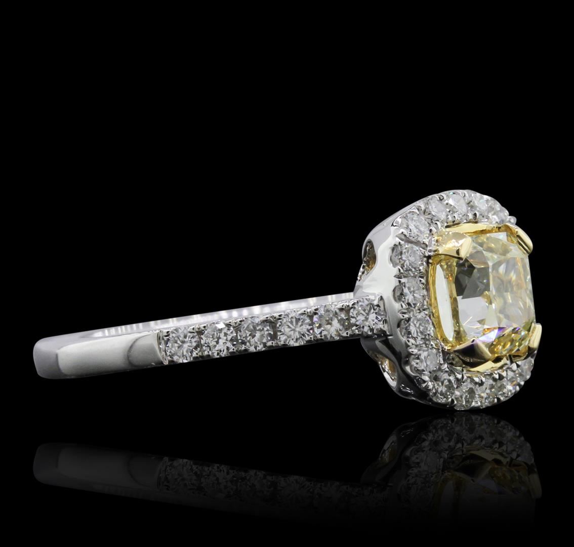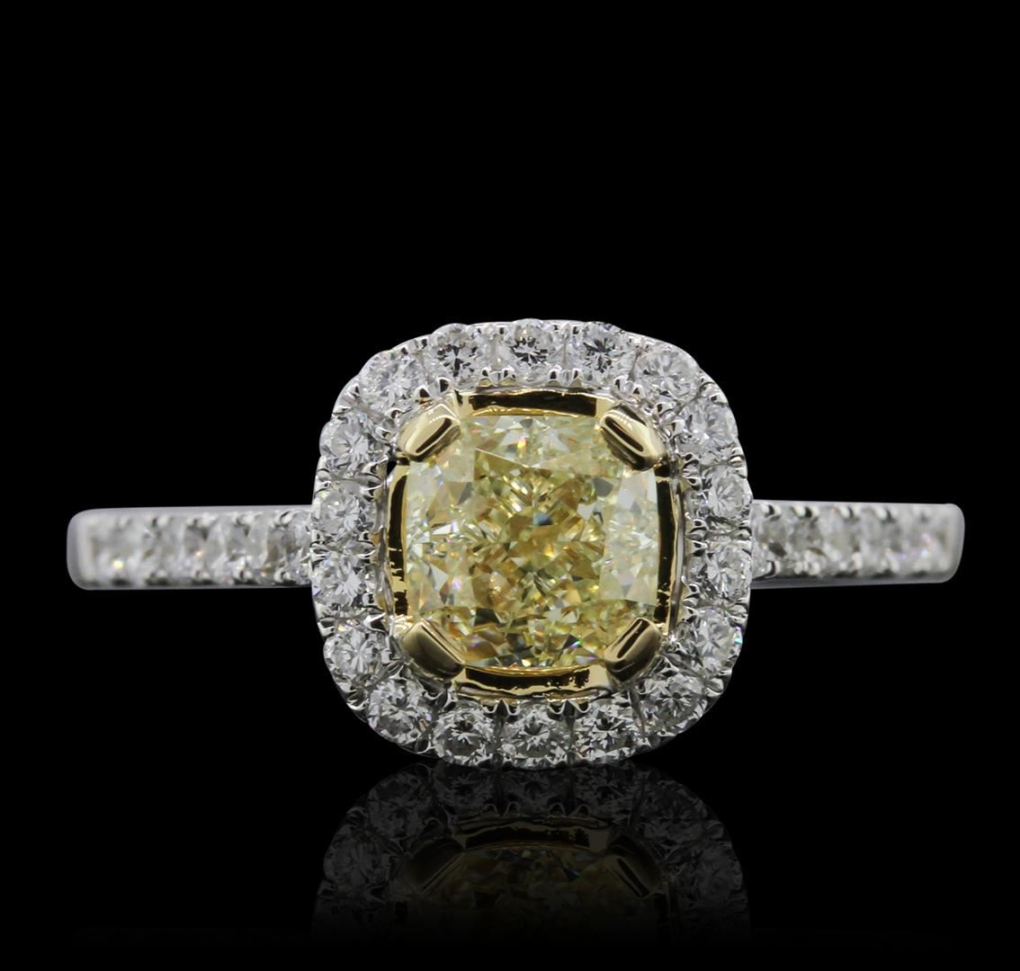One electronically tested 18KT white gold ladies cast diamond ring with a bright polish finish. Condition is new, good workmanship. The featured diamond is mounted in a yellow gold accented basket, set within a diamond bezel supported by diamond set shoulders and completed by a two millimeter wide band. Trademark is DAYANII. Identified with markings of "18K 750". Containing: One prong set cushion cut diamond, measuring 5.35 x 5.40 x 3.35mm (depth est.), 8.00% GRCF approximate weight of 1.05ct with a strong blue fluorescence. Graded in the setting. Clarity VS-2 Color Light Yellow Depth 62.0% Table 57.4% Thirty prong set round brilliant cut diamonds, measuring 1.60 - 1.50 x 0.93mm (depth est.) approximate total weight of 30 Stones = 0.51ct. Graded in the setting. Clarity SI-1 to I-1 Color F -H Total Weight of Diamonds 1.56ct. Total Weight of Ring 3.50 grams. AIG appraised at $11,110.00. AIG Appraised at $11,110.00.