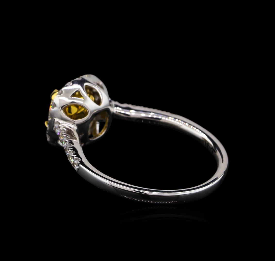 One electronically tested 18KT white gold ladies cast diamond ring with a bright polish finish. Condition is new, good workmanship. The featured diamond is mounted in a yellow gold accented basket, set within a diamond bezel supported by diamond set shoulders and completed by a two millimeter wide band. Trademark is DAYANII. Identified with markings of "18K 750". Containing: One prong set cushion cut diamond, measuring 5.35 x 5.40 x 3.35mm (depth est.), 8.00% GRCF approximate weight of 1.05ct with a strong blue fluorescence. Graded in the setting. Clarity VS-2 Color Light Yellow Depth 62.0% Table 57.4% Thirty prong set round brilliant cut diamonds, measuring 1.60 - 1.50 x 0.93mm (depth est.) approximate total weight of 30 Stones = 0.51ct. Graded in the setting. Clarity SI-1 to I-1 Color F -H Total Weight of Diamonds 1.56ct. Total Weight of Ring 3.50 grams. AIG appraised at $11,110.00. AIG Appraised at $11,110.00.