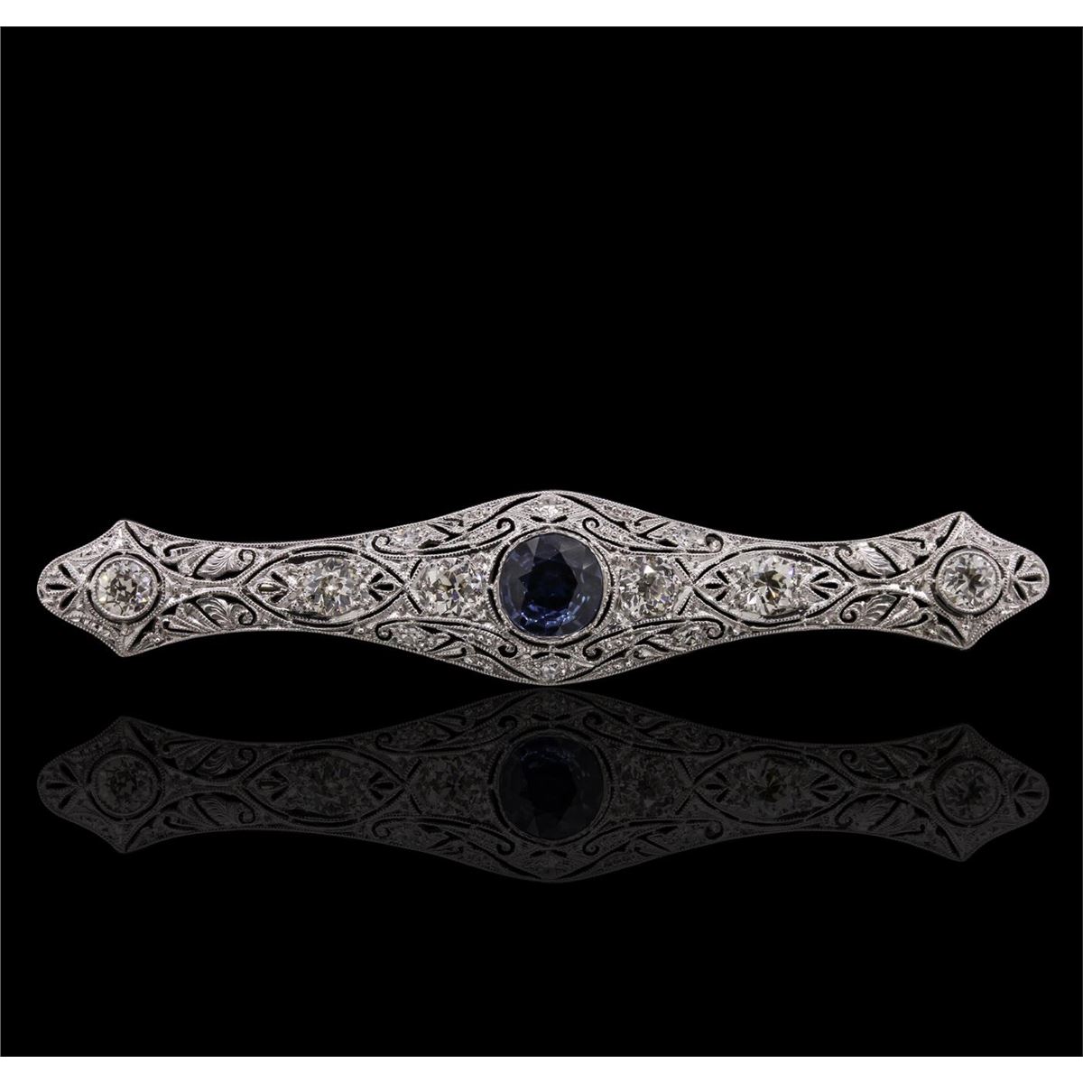 One electronically tested 18KT white gold Ladies combination cast & assembled pin with a antiqued finish. Condition is new. Containing: One gypsy set round modified brilliant cut natural blue sapphire, measuring 7.50 - 7.50 x 3.50 mm, approximate weight of 1.58ct., clarity is eye clean, type II, medium light, very slightly grayish, blue color, (GIA B 4/3), cut is good. Colored gemstones are presumed to have been subjected to commonly used color/clarity enhancement processes. Six gypsy set Old European cut diamonds, measuring 4.10 - 3.80 x 2.36mm (depth est.) approximate. Total Weight of 6 Stones = 1.35ct. Clarity: SI-1. Color: J - K, Cut is Good. Total Weight of Colored Stones 1.58ct. Total Weight of Diamonds 1.35ct. Total Weight of Pin 8.20 grams. GGL Appraised at $7,750.00.