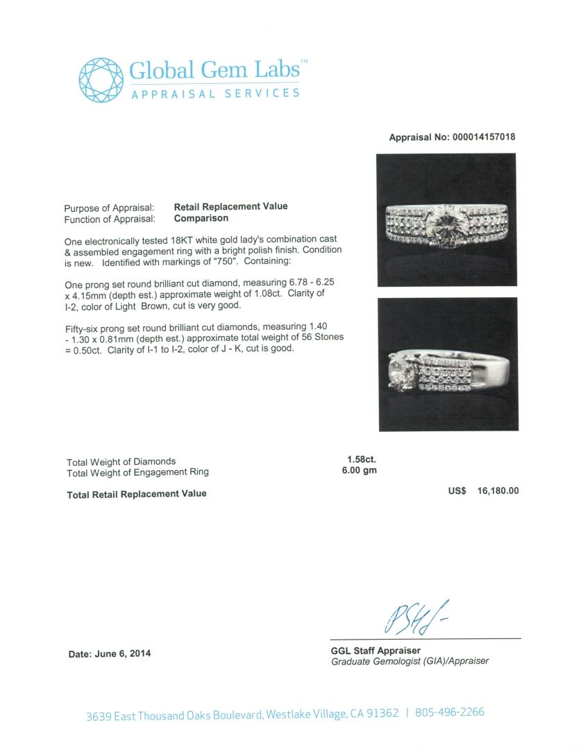 One electronically tested 18KT white gold Ladies combination cast & assembled engagement ring with a bright polish finish. Condition is new. Identified with markings of "750". Containing: One prong set round brilliant cut diamond, measuring 6.78 - 6.25 x 4.15mm (depth est.) approximate weight of 1.08ct. Clarity: I-2, Cut is Very Good. Fifty-Six prong set round brilliant cut diamonds, measuring 1.40 - 1.30 x 0.81mm (depth est.) approximate. Total Weight of 56 Stones = 0.50ct. Clarity: I-1 to I-2. Color: J - K, Cut is Good. Total Weight of Diamonds 1.58ct. Total Weight of Engagement Ring 6.00 grams. GGL Appraised at $16,180.00.