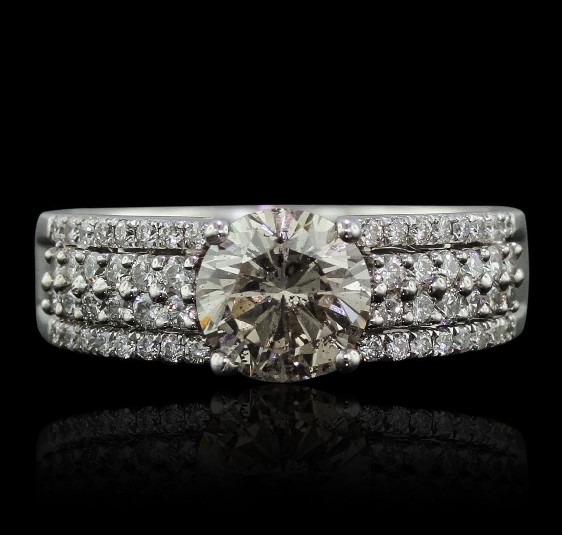 One electronically tested 18KT white gold Ladies combination cast & assembled engagement ring with a bright polish finish. Condition is new. Identified with markings of "750". Containing: One prong set round brilliant cut diamond, measuring 6.78 - 6.25 x 4.15mm (depth est.) approximate weight of 1.08ct. Clarity: I-2, Cut is Very Good. Fifty-Six prong set round brilliant cut diamonds, measuring 1.40 - 1.30 x 0.81mm (depth est.) approximate. Total Weight of 56 Stones = 0.50ct. Clarity: I-1 to I-2. Color: J - K, Cut is Good. Total Weight of Diamonds 1.58ct. Total Weight of Engagement Ring 6.00 grams. GGL Appraised at $16,180.00.