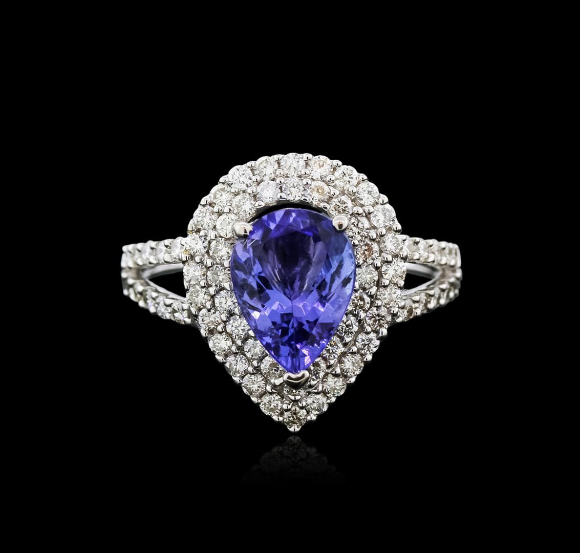 One electronically tested 18KT white gold ladies cast tanzanite and diamond ring with a flat shank with rounded edges with a bright polish finish. Trademark is Orianne. Identified with markings of "18K". Condition is new. Containing: One prong set pear modified brilliant cut natural tanzanite, measuring 8.74 x 7.11 x 3.81mm, approximate weight of 1.59ct., clarity is eye clean, type I, medium light, very slightly grayish, violet color, (GIA V 4/3), cut is good. Sixty-Six prong set round brilliant cut diamonds, measuring 1.30 - 1.30 x 0.78mm (depth est.) approximate total weight of 66 Stones = 0.53ct. Clarity: SI-2 to I-2. Color: I - J. All diamonds and colored gemstones are graded in the mounting, unless otherwise stated. Colored gemstones are presumed to have been subjected to commonly used enhancement processes. Total Weight of Colored Stones 1.59ct. Total Weight of Diamonds 0.53ct. Total Weight of Ring 4.20 grams. GGL Appraised at $3,895.00.