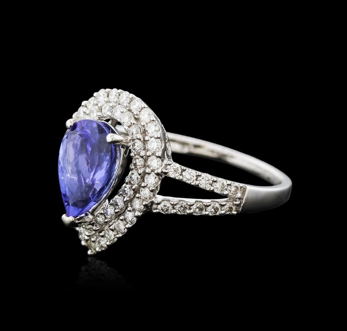 One electronically tested 18KT white gold ladies cast tanzanite and diamond ring with a flat shank with rounded edges with a bright polish finish. Trademark is Orianne. Identified with markings of "18K". Condition is new. Containing: One prong set pear modified brilliant cut natural tanzanite, measuring 8.74 x 7.11 x 3.81mm, approximate weight of 1.59ct., clarity is eye clean, type I, medium light, very slightly grayish, violet color, (GIA V 4/3), cut is good. Sixty-Six prong set round brilliant cut diamonds, measuring 1.30 - 1.30 x 0.78mm (depth est.) approximate total weight of 66 Stones = 0.53ct. Clarity: SI-2 to I-2. Color: I - J. All diamonds and colored gemstones are graded in the mounting, unless otherwise stated. Colored gemstones are presumed to have been subjected to commonly used enhancement processes. Total Weight of Colored Stones 1.59ct. Total Weight of Diamonds 0.53ct. Total Weight of Ring 4.20 grams. GGL Appraised at $3,895.00.