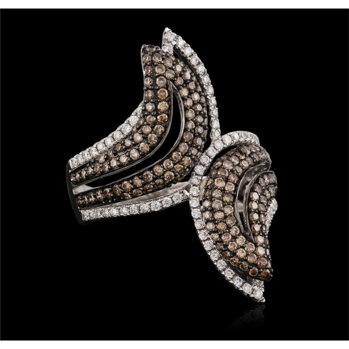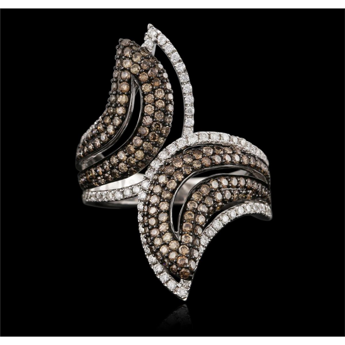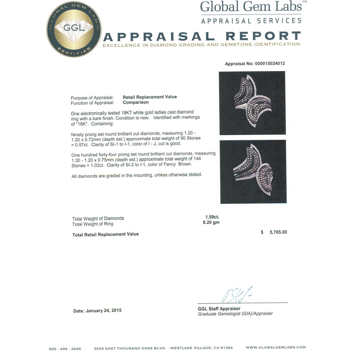 One electronically tested 18KT white gold ladies cast diamond ring with a bark finish. Identified with markings of "18K". Condition is new. Containing: Ninety prong set round brilliant cut diamonds, measuring 1.20 - 1.20 x 0.72mm (depth est.) approximate total weight of 90 Stones = 0.57ct. Clarity: SI-1 to I-1. Color: I - J, Cut is Good. One Hundred Forty-Four prong set round brilliant cut diamonds, measuring 1.30 - 1.20 x 0.75mm (depth est.) approximate total weight of 144 Stones = 1.02ct. Clarity: SI-2 to I-1. All diamonds are graded in the mounting, unless otherwise stated. Total Weight of Diamonds 1.59ct. Total Weight of Ring 8.20 grams. GGL Appraised at $5,765.00.