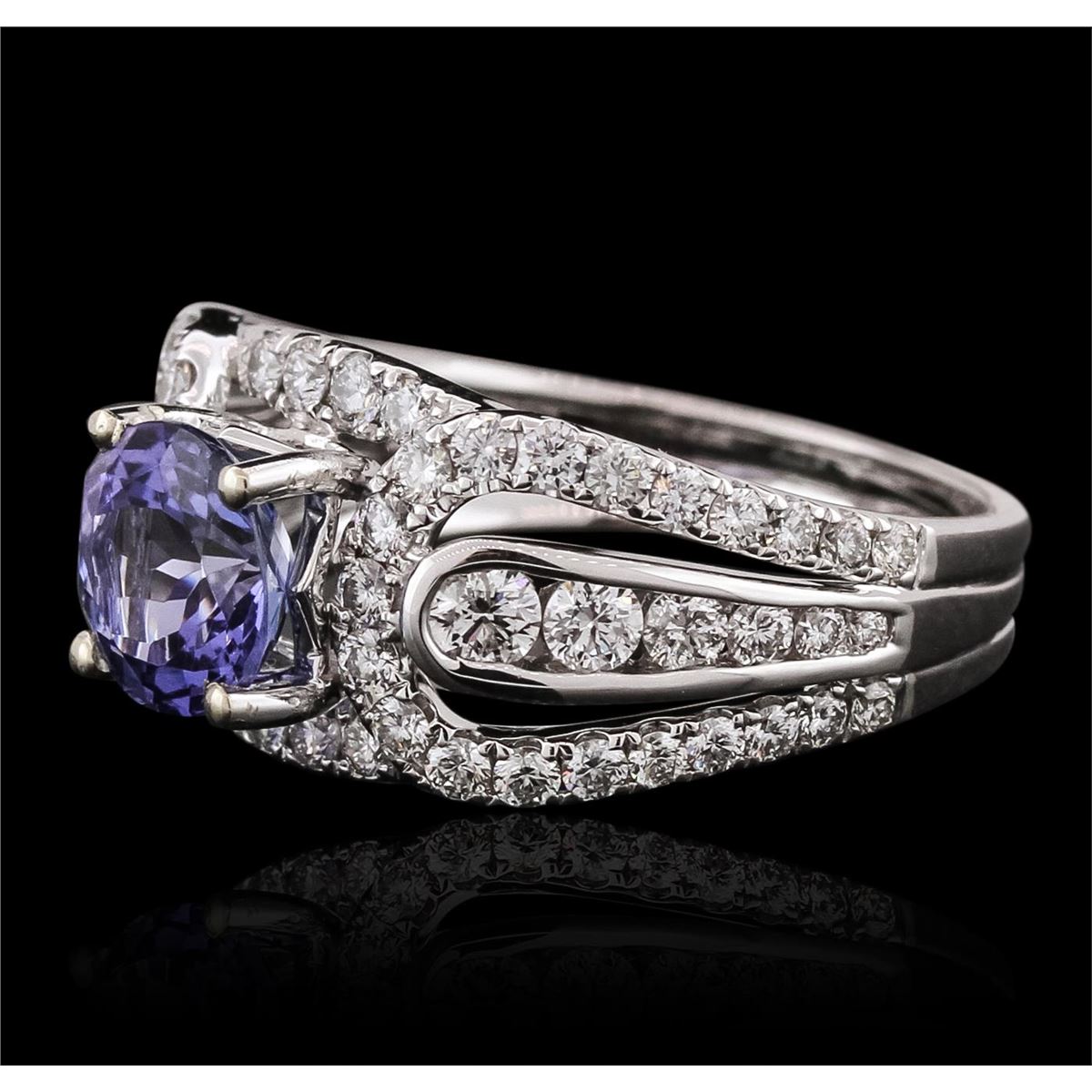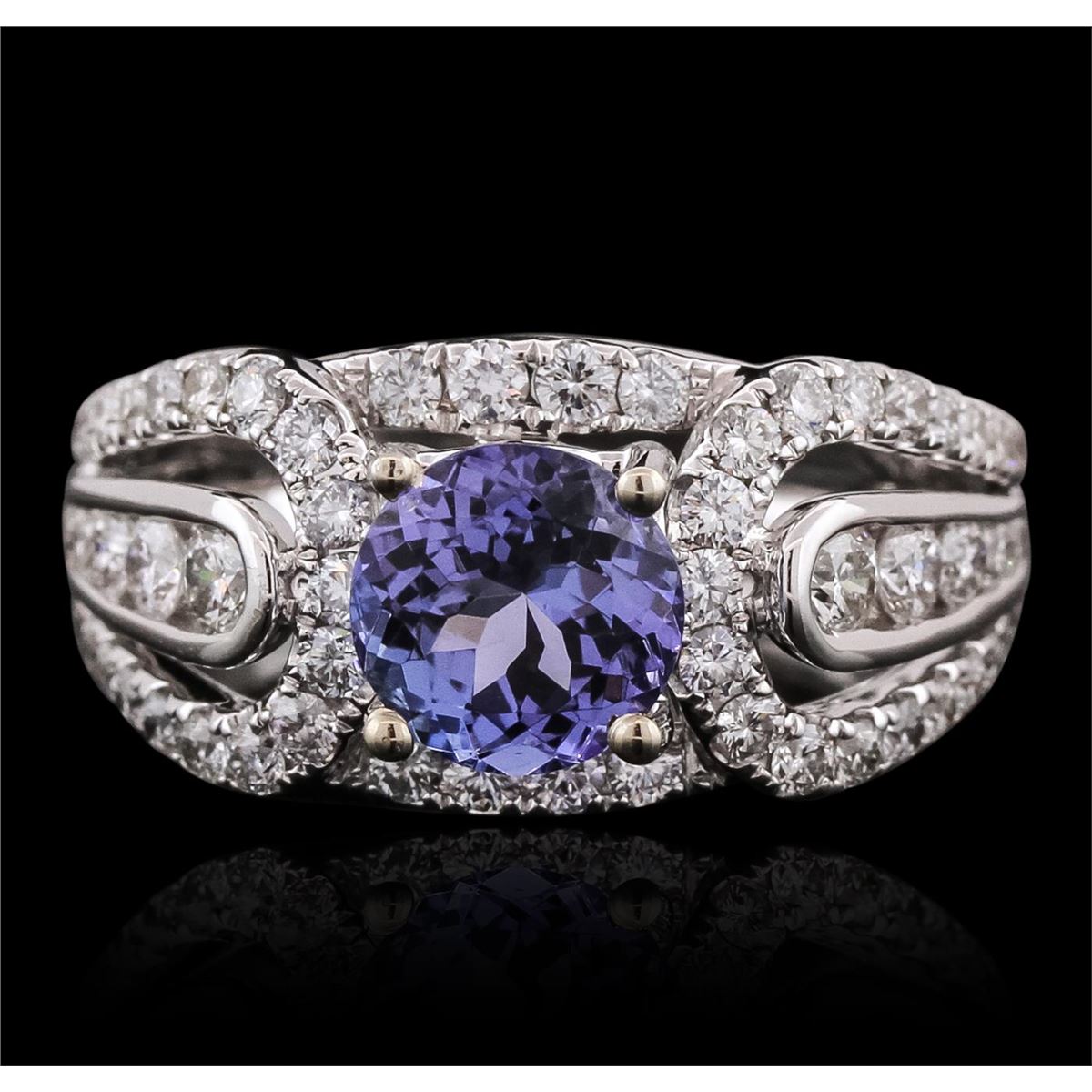 One electronically tested 18KT White Gold ladies cast tanzanite and diamond ring with a bright polish finish. The featured tanzanite is supported by elaborate diamond set shoulders, completed by a grooved three millimeter wide band. Identified with markings of "18K 750". Condition is new, good workmanship. Containing: One prong set round brilliant cut natural tanzanite, measuring 7.10 - 7.05 x 4.40 mm, 8% bulge factor, approximate weight of 1.60ct., clarity is eye clean, type I, dark, very slightly grayish, violetish blue color, (GIA vB 7/3), cut is good. Transmitting light with no distortion, transparent. Graded in the setting. Tanzanite is a very rare gemstone that is only found in the country of Tanzania. Originally discovered in 1967. Tiffany & Company, named the stone Tanzanite. It is found in the Usumburu Mountains that border the Umba Valley of northern Tanzania. Tanzanite occurs in gray, brown, violet, blue, reddish-purple, & green. The gem is interesting because of its exceptional pleochroism. Rotated in different directions a tanzanite will exhibit multiple changes of color. Tanzanite has a low tolerance to ultrasonic cleaning, and should not be cleaned using this method. Sixty-Two prong and channel set round brilliant cut diamonds approximate total weight of 62 Stones = 1.13ct. Graded in the setting. Clarity: VS-1 to SI-1. Color: H - J. Total Weight of Colored Stones 1.60ct. Total Weight of Diamonds 1.13ct. Total Weight of Ring 5.58 grams. AIG Appraised at $8,380.00.
