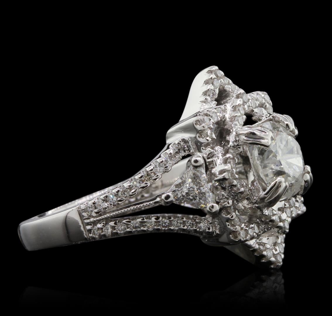One electronically tested 18KT White Gold ladies cast diamond ring with a bright polish finish. Condition is new, good workmanship. The ring features a diamond set within an elaborate diamond lattice gallery supported by diamond set split shoulders, completed by a two and one-half millimeter wide band. Identified with markings of "18K 750". Containing: One prong set round brilliant cut diamond, measuring 6.25 - 6.20 x 3.90mm (depth est.) approximate weight of 1.03ct. Graded in the setting. Clarity: I-1. Color: I. Depth: 62.6%. Table 61.0%. Two prong set triangle brilliant cut diamonds, measuring 3.70 x 3.60 x 1.90mm (depth est.) approximate. Total Weight of 2 Stones = 0.30ct. Graded in the setting. Clarity: VS-1 to VS-2. Color: G - H. Eighty-Six prong set round brilliant cut diamonds, measuring 1.00 - 0.90 x 0.57mm (depth est.) approximate. Total Weight of 86 Stones = 0.29ct. Graded in the setting. Clarity: VS-2 to SI-2. Color: G - I. Total Weight of Diamonds 1.62ct. Total Weight of Ring 7.41gm. AIG Appraised at $19,750.00.