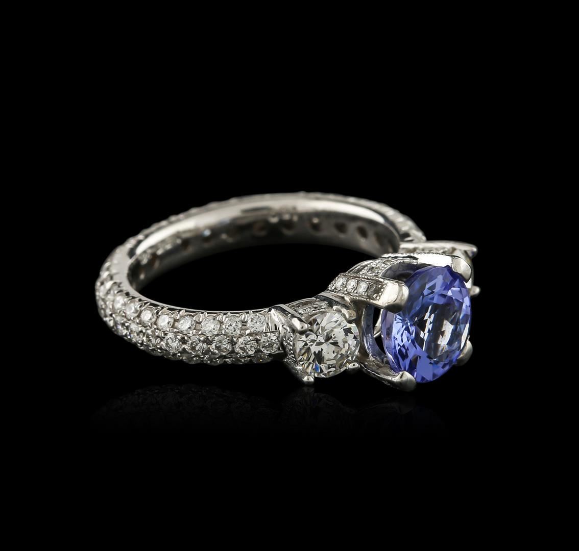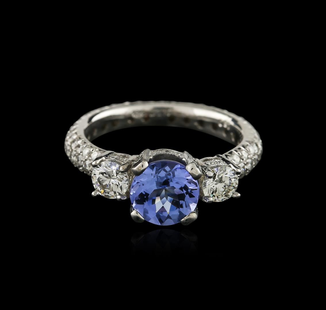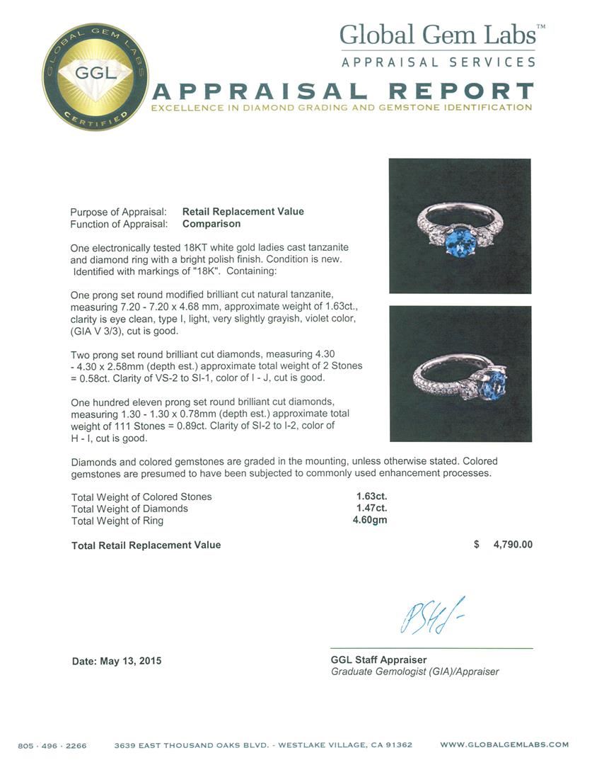One electronically tested 18KT white gold ladies cast tanzanite and diamond ring with a bright polish finish. Identified with markings of "18K". Condition is new. Containing: One prong set round modified brilliant cut natural tanzanite, measuring 7.20 - 7.20 x 4.68 mm, approximate weight of 1.63ct., clarity is eye clean, type I, light, very slightly grayish, violet color, (GIA V 3/3), cut is good. Two prong set round brilliant cut diamonds, measuring 4.30 - 4.30 x 2.58mm (depth est.) approximate total weight of 2 Stones = 0.58ct. Clarity: VS-2 to SI-1. Color: I - J, Cut is Good. One Hundred Eleven prong set round brilliant cut diamonds, measuring 1.30 - 1.30 x 0.78mm (depth est.) approximate total weight of 111 Stones = 0.89ct. Clarity: SI-2 to I-2. Color: H - I, Cut is Good. Diamonds and colored gemstones are graded in the mounting, unless otherwise stated. Colored gemstones are presumed to have been subjected to commonly used enhancement processes. Total Weight of Colored Stones 1.63ct. Total Weight of Diamonds 1.47ct. Total Weight of Ring 4.60 grams. GGL Appraised at $4,790.00.