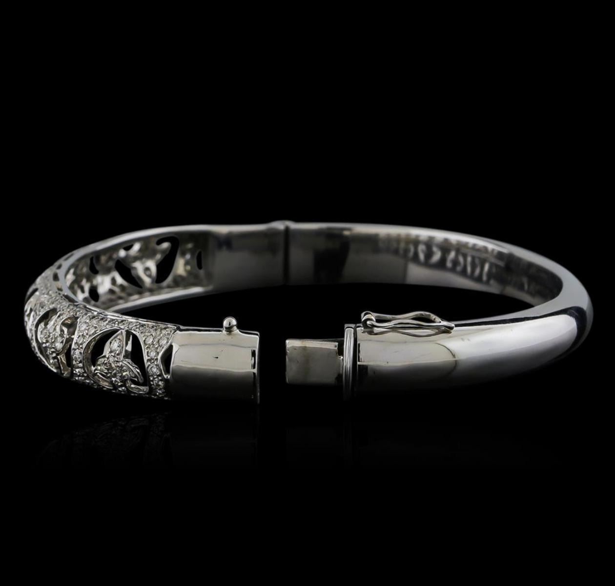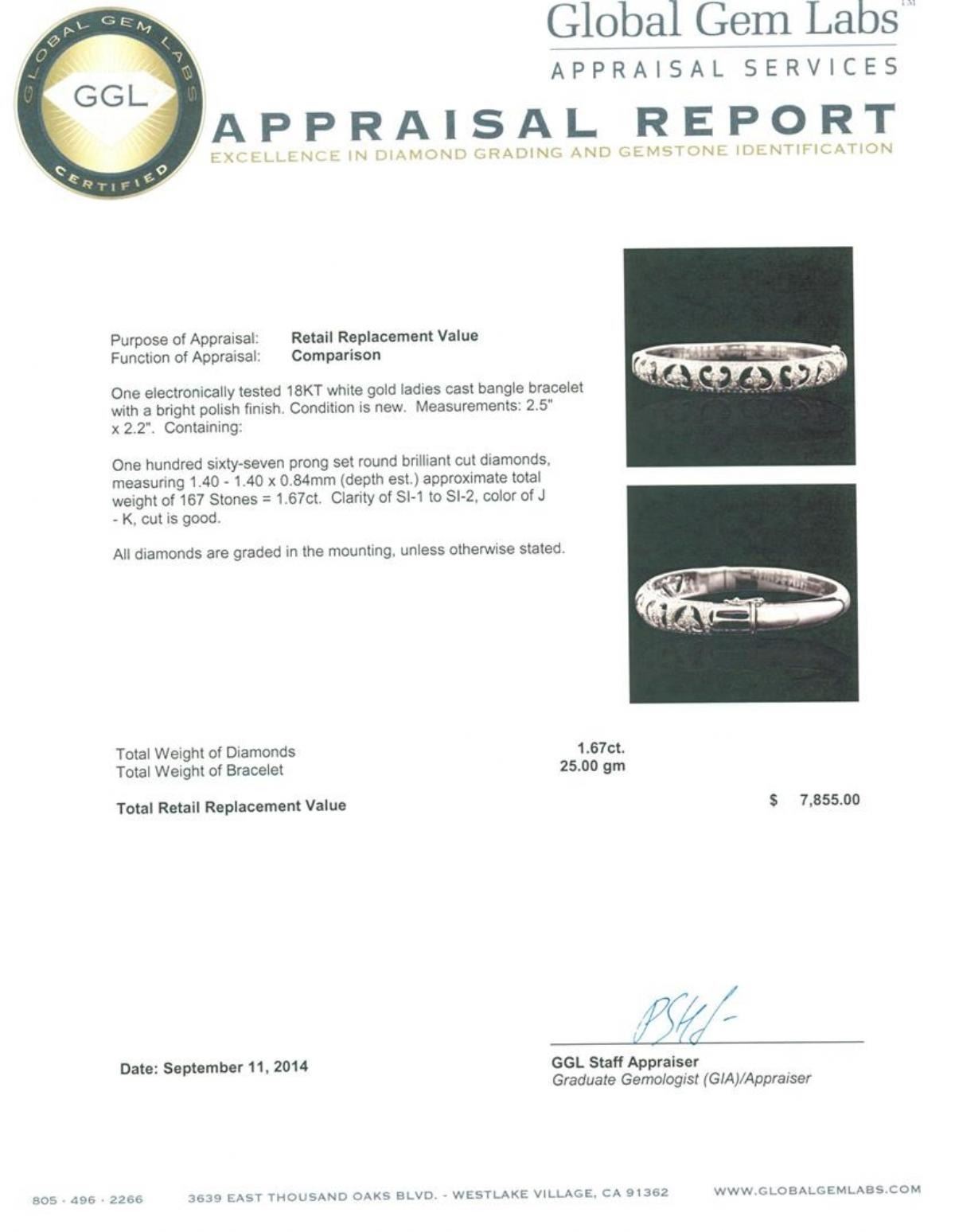 One electronically tested 18KT white gold ladies cast bangle bracelet with a bright polish finish. Measurements: 2.5" x 2.2". Condition is new. Containing: One Hundred Sixty-Seven prong set round brilliant cut diamonds, measuring 1.40 - 1.40 x 0.84mm (depth est.) approximate total weight of 167 Stones = 1.67ct. Clarity: SI-1 to SI-2. Color: J - K, Cut is Good. All diamonds are graded in the mounting, unless otherwise stated. Total Weight of Diamonds 1.67ct. Total Weight of Bracelet 25.00 grams. GGL Appraised.