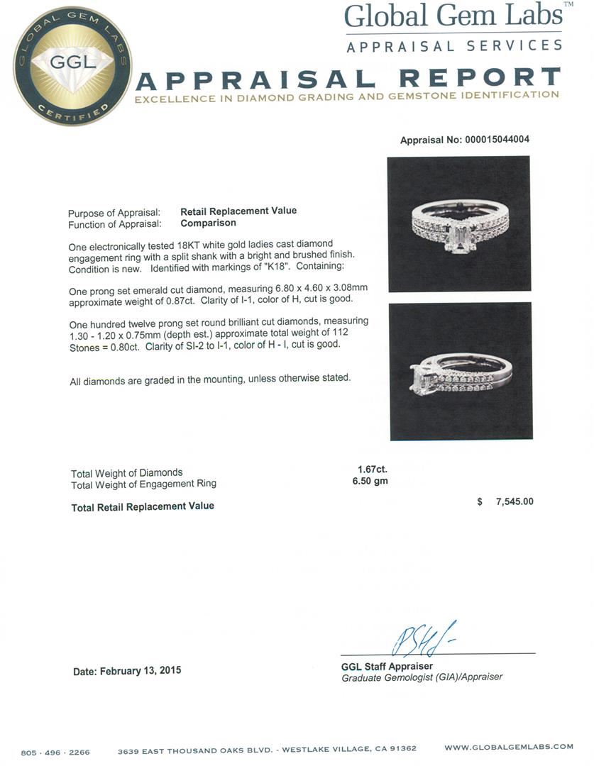 One electronically tested 18KT white gold ladies cast diamond engagement ring with a split shank with a bright and brushed finish. Identified with markings of "K18". Condition is new. Containing: One prong set emerald cut diamond, measuring 6.80 x 4.60 x 3.08mm approximate weight of 0.87ct. Clarity: I-1. Color: H, Cut is Good. One Hundred Twelve prong set round brilliant cut diamonds, measuring 1.30 - 1.20 x 0.75mm (depth est.) approximate total weight of 112 Stones = 0.80ct. Clarity: SI-2 to I-1. Color: H - I, Cut is Good. All diamonds are graded in the mounting, unless otherwise stated. Total Weight of Diamonds 1.67ct. Total Weight of Engagement Ring 6.50 grams. GGL Appraised at $7,545.00.