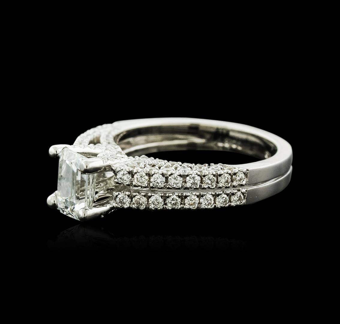 One electronically tested 18KT white gold ladies cast diamond engagement ring with a split shank with a bright and brushed finish. Identified with markings of "K18". Condition is new. Containing: One prong set emerald cut diamond, measuring 6.80 x 4.60 x 3.08mm approximate weight of 0.87ct. Clarity: I-1. Color: H, Cut is Good. One Hundred Twelve prong set round brilliant cut diamonds, measuring 1.30 - 1.20 x 0.75mm (depth est.) approximate total weight of 112 Stones = 0.80ct. Clarity: SI-2 to I-1. Color: H - I, Cut is Good. All diamonds are graded in the mounting, unless otherwise stated. Total Weight of Diamonds 1.67ct. Total Weight of Engagement Ring 6.50 grams. GGL Appraised at $7,545.00.