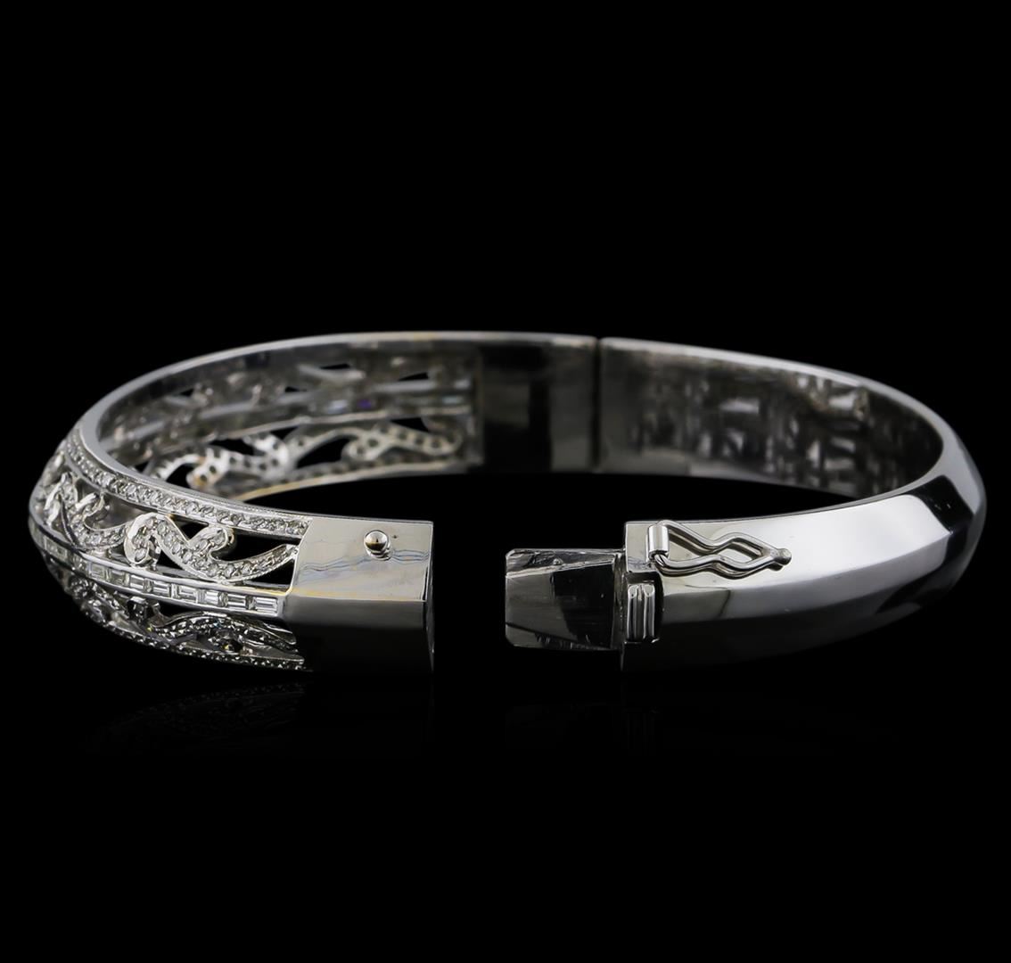 One electronically tested 18KT white gold ladies combination cast & assembled bangle bracelet with a bright polish finish. Measurements: 2.50" x 2.20". Identified with markings of "18K". Condition is new. Containing: Two Hundred Ninety-Eight prong set round brilliant cut diamonds, measuring 1.00 - 1.00 x 0.60mm (depth est.) approximate total weight of 298 Stones = 1.07ct. Clarity: SI-1 to SI-2. Color: I - J, Cut is Good. Thirty-Nine channel set baguette cut diamonds, measuring 2.00 x 1.00 x 0.85mm (depth est.) approximate total weight of 39 Stones = 0.61ct. Clarity: SI-1. Color: H - I, Cut is Good. All diamonds are graded in the mounting, unless otherwise stated. Total Weight of Diamonds 1.68ct. Total Weight of Bracelet 34.60 grams. GGL Appraised at $9,865.00.