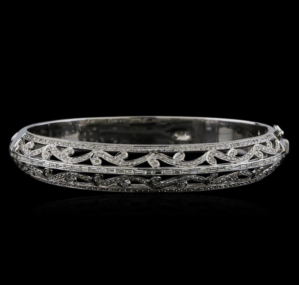 One electronically tested 18KT white gold ladies combination cast & assembled bangle bracelet with a bright polish finish. Measurements: 2.50" x 2.20". Identified with markings of "18K". Condition is new. Containing: Two Hundred Ninety-Eight prong set round brilliant cut diamonds, measuring 1.00 - 1.00 x 0.60mm (depth est.) approximate total weight of 298 Stones = 1.07ct. Clarity: SI-1 to SI-2. Color: I - J, Cut is Good. Thirty-Nine channel set baguette cut diamonds, measuring 2.00 x 1.00 x 0.85mm (depth est.) approximate total weight of 39 Stones = 0.61ct. Clarity: SI-1. Color: H - I, Cut is Good. All diamonds are graded in the mounting, unless otherwise stated. Total Weight of Diamonds 1.68ct. Total Weight of Bracelet 34.60 grams. GGL Appraised at $9,865.00.