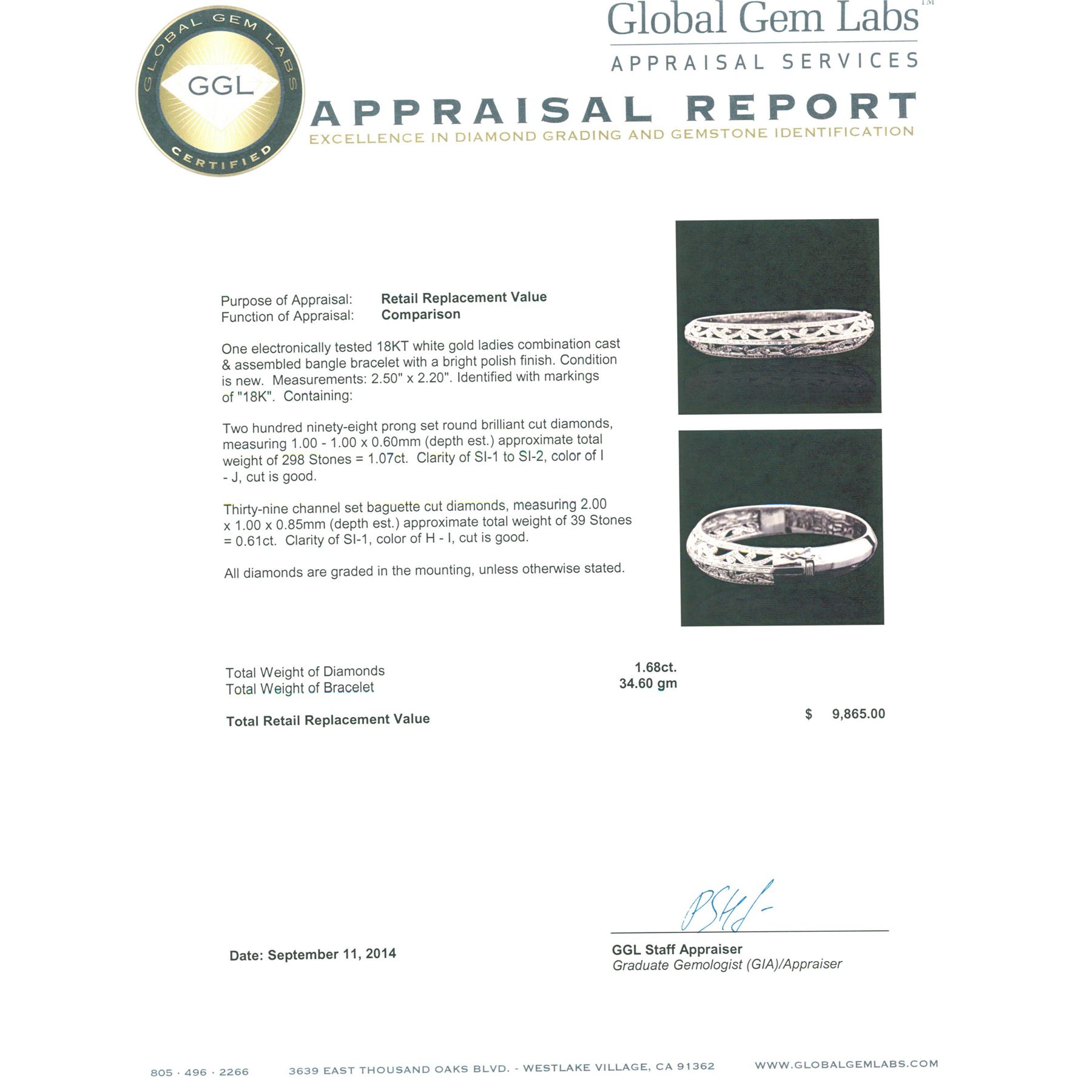 One electronically tested 18KT white gold ladies combination cast & assembled bangle bracelet with a bright polish finish. Measurements: 2.50" x 2.20". Identified with markings of "18K". Condition is new. Containing: Two Hundred Ninety-Eight prong set round brilliant cut diamonds, measuring 1.00 - 1.00 x 0.60mm (depth est.) approximate total weight of 298 Stones = 1.07ct. Clarity: SI-1 to SI-2. Color: I - J, Cut is Good. Thirty-Nine channel set baguette cut diamonds, measuring 2.00 x 1.00 x 0.85mm (depth est.) approximate total weight of 39 Stones = 0.61ct. Clarity: SI-1. Color: H - I, Cut is Good. All diamonds are graded in the mounting, unless otherwise stated. Total Weight of Diamonds 1.68ct. Total Weight of Bracelet 34.60 grams. GGL Appraised at $9,865.00.