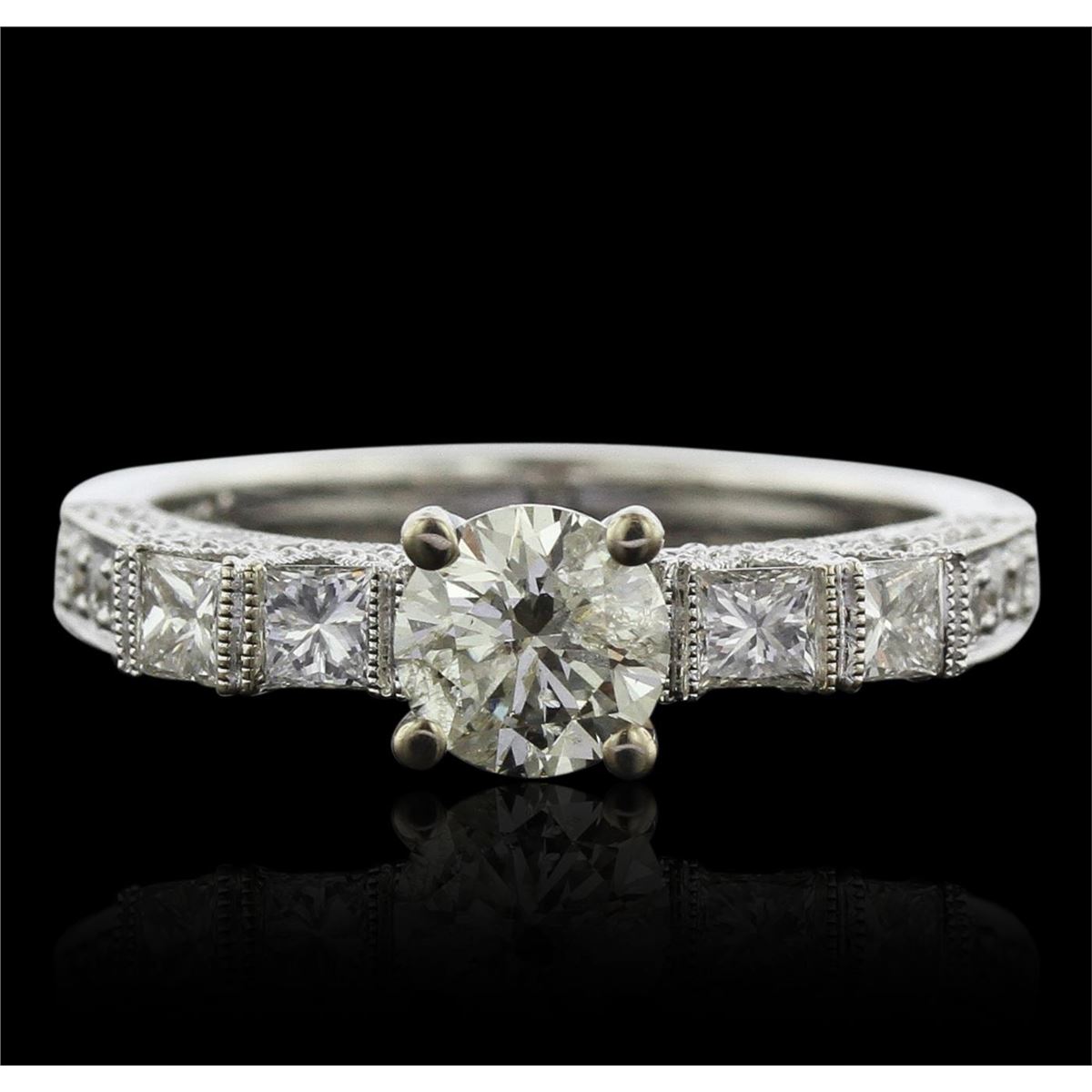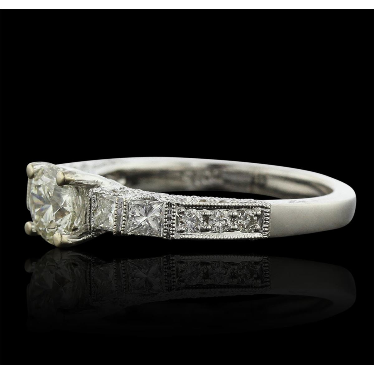 One electronically tested 18KT white gold ladies cast diamond ring with a bright and milgrain finish. Condition is new, good workmanship. The featured diamond is supported by diamond set shoulders and completed by a two and one-half millimeter wide band. Identified with markings of "18K". Containing: One prong set round brilliant cut diamond, measuring 5.60 - 5.60 x 3.36mm (depth est.) approximate weight of 0.74ct. Graded in the setting. Clarity: I-1 . Color: 60.0%. Table 58.9%. Four channel set princess cut diamonds, measuring 2.70 x 2.50 x 1.88mm (depth est.) approximate. Total Weight of 4 Stones = 0.45ct. Measurements are an average for the group. Graded in the setting. Clarity: VVS-2 to VS-2. Color: G - I Forty-Two bead set round brilliant cut diamonds, measuring 1.70 - 1.20 x 0.87mm (depth est.) approximate. Total Weight of 42 Stones = 0.50ct. Graded in the setting. Clarity: VS-2 to SI-2 . Color: G - I. Total Weight of Diamonds 1.69ct.. Total Weight of Ring 4.80 grams. AIG Appraised at $9,510.00.