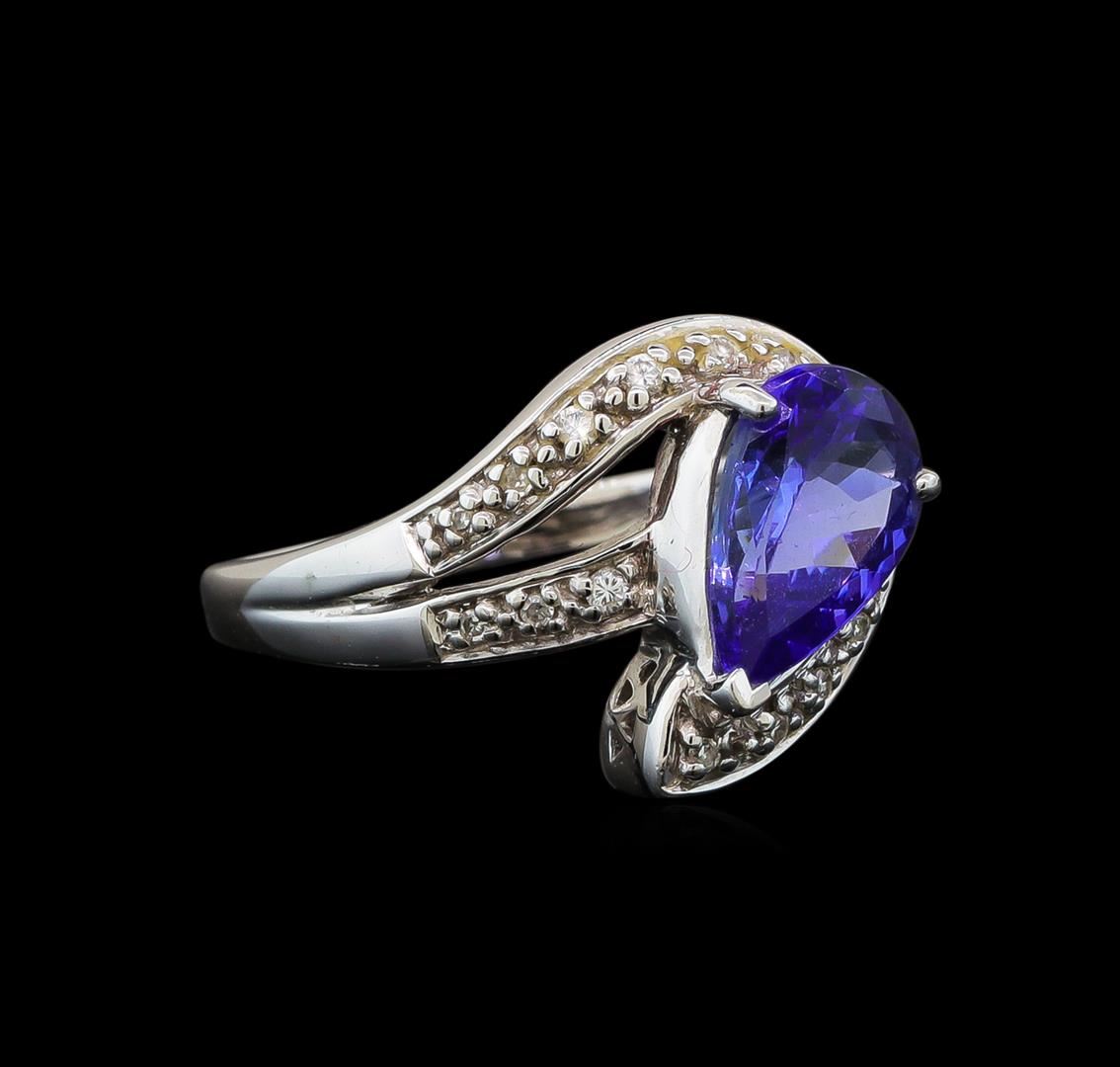 One electronically tested 18KT white gold ladies cast tanzanite and diamond ring with a bright polish finish. Identified with markings of "18K". Condition is new. Containing: One prong set pear modified brilliant cut natural tanzanite, measuring 10.30 x 6.20 x 4.03mm, approximate weight of 1.72ct., clarity is eye clean, type I, medium light, very slightly grayish, violet color, (GIA V 4/3), cut is good. Sixteen prong set single cut diamonds, measuring 1.50 - 1.20 x 0.81mm (depth est.) approximate total weight of 16 Stones = 0.14ct. Clarity: I-1 to I-2. Color: I - J. Colored gemstones are presumed to have been subjected to commonly used enhancement processes. All diamonds and colored gemstones are graded in the mounting, unless otherwise stated. Total Weight of Colored Stones 1.72ct. Total Weight of Diamonds 0.14ct. Total Weight of Ring 5.50 grams. GGL Appraised.
