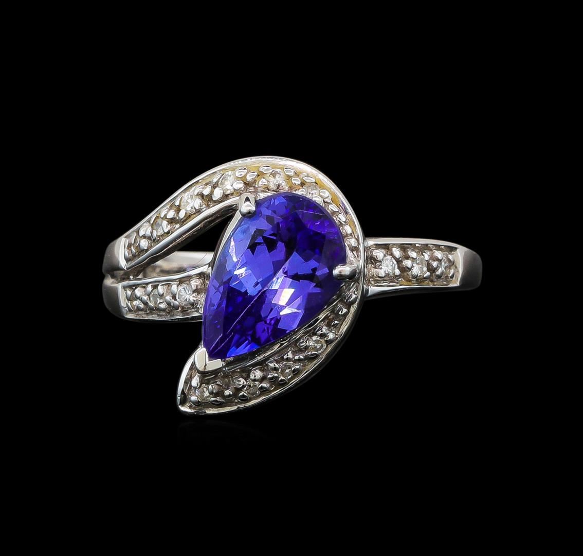 One electronically tested 18KT white gold ladies cast tanzanite and diamond ring with a bright polish finish. Identified with markings of "18K". Condition is new. Containing: One prong set pear modified brilliant cut natural tanzanite, measuring 10.30 x 6.20 x 4.03mm, approximate weight of 1.72ct., clarity is eye clean, type I, medium light, very slightly grayish, violet color, (GIA V 4/3), cut is good. Sixteen prong set single cut diamonds, measuring 1.50 - 1.20 x 0.81mm (depth est.) approximate total weight of 16 Stones = 0.14ct. Clarity: I-1 to I-2. Color: I - J. Colored gemstones are presumed to have been subjected to commonly used enhancement processes. All diamonds and colored gemstones are graded in the mounting, unless otherwise stated. Total Weight of Colored Stones 1.72ct. Total Weight of Diamonds 0.14ct. Total Weight of Ring 5.50 grams. GGL Appraised.