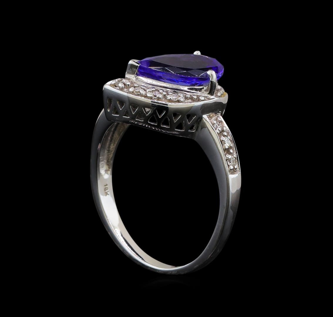 One electronically tested 18KT white gold ladies cast tanzanite and diamond ring with a bright polish finish. Identified with markings of "18K". Condition is new. Containing: One prong set pear modified brilliant cut natural tanzanite, measuring 10.30 x 6.20 x 4.03mm, approximate weight of 1.72ct., clarity is eye clean, type I, medium light, very slightly grayish, violet color, (GIA V 4/3), cut is good. Sixteen prong set single cut diamonds, measuring 1.50 - 1.20 x 0.81mm (depth est.) approximate total weight of 16 Stones = 0.14ct. Clarity: I-1 to I-2. Color: I - J. Colored gemstones are presumed to have been subjected to commonly used enhancement processes. All diamonds and colored gemstones are graded in the mounting, unless otherwise stated. Total Weight of Colored Stones 1.72ct. Total Weight of Diamonds 0.14ct. Total Weight of Ring 5.50 grams. GGL Appraised.