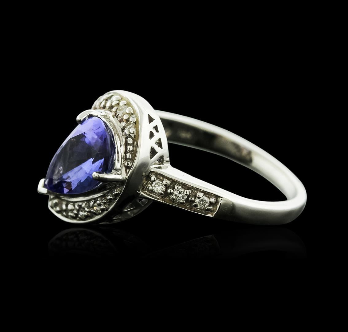 One electronically tested 18KT white gold ladies cast tanzanite and diamond ring with a bright polish finish. Identified with markings of "18K". Condition is new. Containing: One prong set pear modified brilliant cut natural tanzanite, measuring 10.30 x 6.20 x 4.03mm, approximate weight of 1.72ct., clarity is eye clean, type I, medium light, very slightly grayish, violet color, (GIA V 4/3), cut is good. Sixteen prong set single cut diamonds, measuring 1.50 - 1.20 x 0.81mm (depth est.) approximate total weight of 16 Stones = 0.14ct. Clarity: I-1 to I-2. Color: I - J. Colored gemstones are presumed to have been subjected to commonly used enhancement processes. All diamonds and colored gemstones are graded in the mounting, unless otherwise stated. Total Weight of Colored Stones 1.72ct. Total Weight of Diamonds 0.14ct. Total Weight of Ring 5.50 grams. GGL Appraised at $2,070.00.