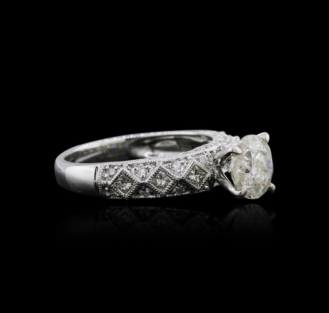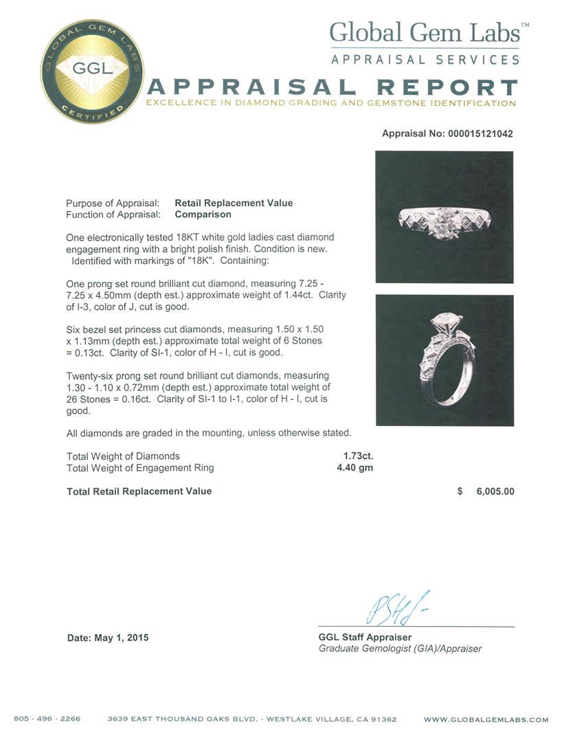 One electronically tested 18KT white gold ladies cast diamond engagement ring with a bright polish finish. Identified with markings of "18K". Condition is new. Containing: One prong set round brilliant cut diamond, measuring 7.25 - 7.25 x 4.50mm (depth est.) approximate weight of 1.44ct. Clarity: I-3. Color: J, Cut is Good. Six bezel set princess cut diamonds, measuring 1.50 x 1.50 x 1.13mm (depth est.) approximate. Total Weight of 6 Stones = 0.13ct. Clarity: SI-1. Color: H - I, Cut is Good. Twenty-Six prong set round brilliant cut diamonds, measuring 1.30 - 1.10 x 0.72mm (depth est.) approximate. Total Weight of 26 Stones = 0.16ct. Clarity: SI-1 to I-1. Color: H - I, Cut is Good. All diamonds are graded in the mounting, unless otherwise stated. Total Weight of Diamonds 1.73ct. Total Weight of Engagement Ring 4.40 grams. GGL Appraised at $6,005.00.