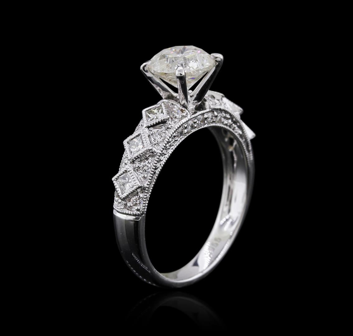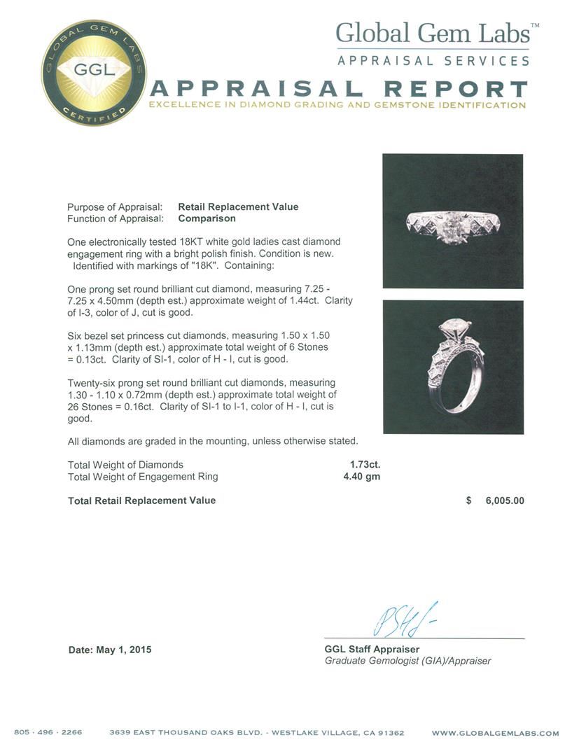 One electronically tested 18KT white gold ladies cast diamond engagement ring with a bright polish finish. Identified with markings of "18K". Condition is new. Containing: One prong set round brilliant cut diamond, measuring 7.25 - 7.25 x 4.50mm (depth est.) approximate weight of 1.44ct. Clarity: I-3. Color: J, Cut is Good. Six bezel set princess cut diamonds, measuring 1.50 x 1.50 x 1.13mm (depth est.) approximate. Total Weight of 6 Stones = 0.13ct. Clarity: SI-1. Color: H - I, Cut is Good. Twenty-Six prong set round brilliant cut diamonds, measuring 1.30 - 1.10 x 0.72mm (depth est.) approximate. Total Weight of 26 Stones = 0.16ct. Clarity: SI-1 to I-1. Color: H - I, Cut is Good. All diamonds are graded in the mounting, unless otherwise stated. Total Weight of Diamonds 1.73ct. Total Weight of Engagement Ring 4.40 grams. GGL Appraised at $6,005.00.