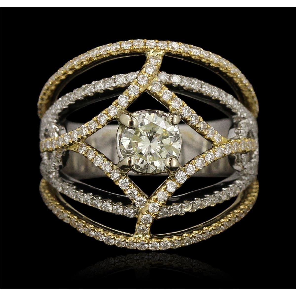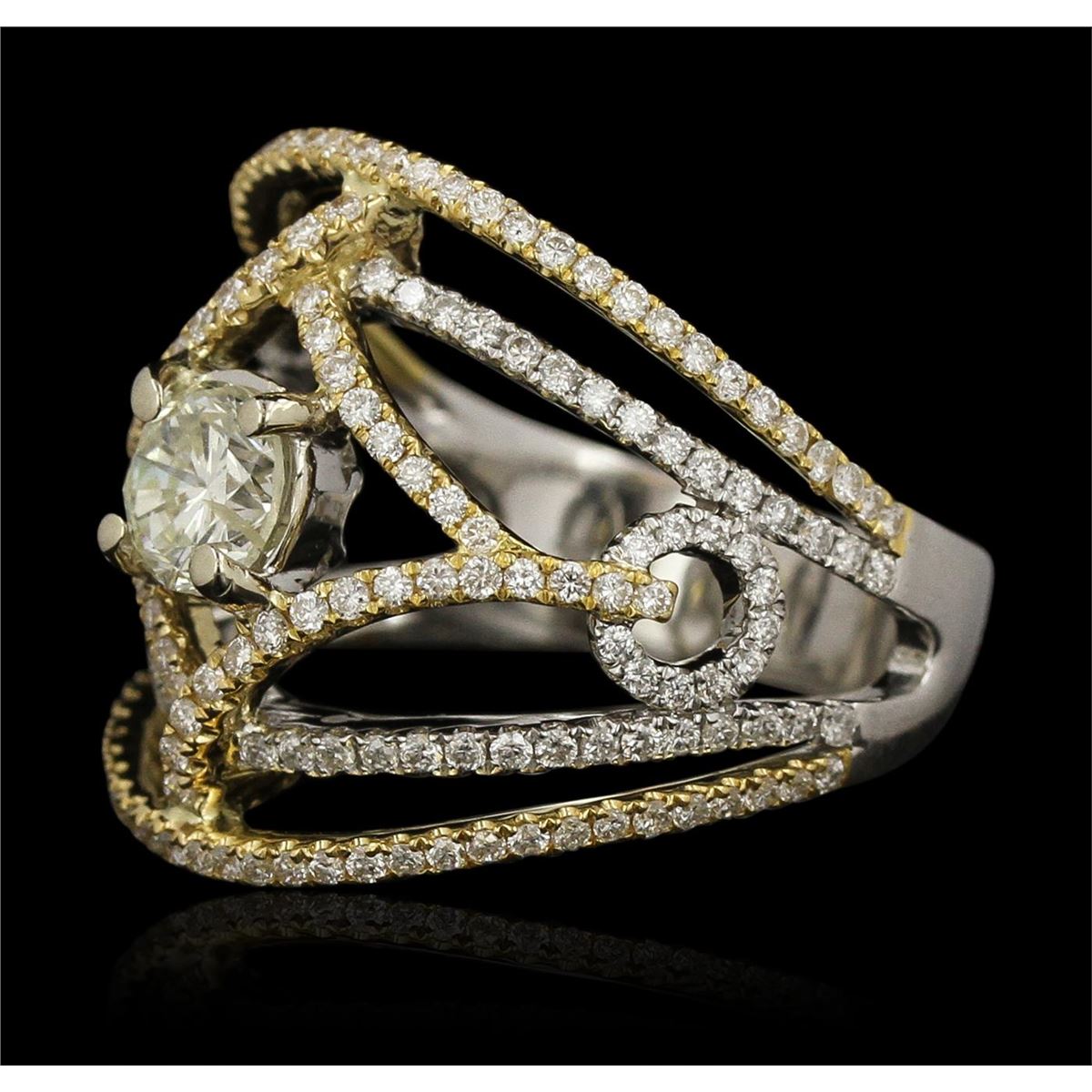 One electronically tested 18KT White Gold ladies cast & assembled diamond ring. Condition is good. The featured diamond is set within intertwining diamond ribbons, completed by a five millimeter wide band. Bright polish finish with Yellow Gold accents. Identified with markings of "K18". Containing: One prong set round brilliant cut diamond, measuring 5.50 - 5.45 x 3.29mm (depth est.) approximate weight of 0.70ct with a medium blue fluorescence. Graded in the setting. Clarity: I-1 . Depth: 60.0%. Table 69.3%. Two Hundred prong set round brilliant cut diamonds, measuring 1.20 - 1.00 x 0.66mm (depth est.) approximate. Total Weight of 200 Stones = 1.05ct. Graded in the setting. Clarity: SI-1 to SI-2 . Color: G - I. Total Weight of Diamonds 1.75ct. Total Weight of Ring 10.03 grams. AIG Appraised at $9,930.00.