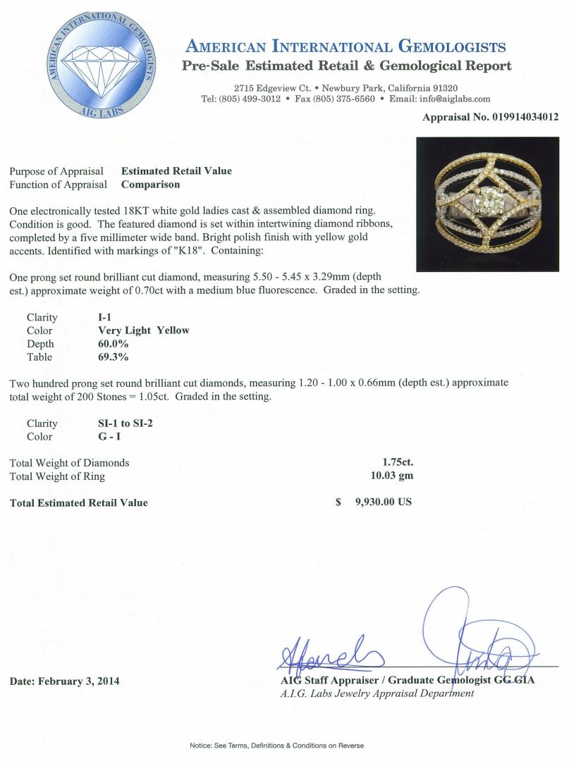 One electronically tested 18KT White Gold ladies cast & assembled diamond ring. Condition is good. The featured diamond is set within intertwining diamond ribbons, completed by a five millimeter wide band. Bright polish finish with Yellow Gold accents. Identified with markings of "K18". Containing: One prong set round brilliant cut diamond, measuring 5.50 - 5.45 x 3.29mm (depth est.) approximate weight of 0.70ct with a medium blue fluorescence. Graded in the setting. Clarity: I-1 . Depth: 60.0%. Table 69.3%. Two Hundred prong set round brilliant cut diamonds, measuring 1.20 - 1.00 x 0.66mm (depth est.) approximate. Total Weight of 200 Stones = 1.05ct. Graded in the setting. Clarity: SI-1 to SI-2 . Color: G - I. Total Weight of Diamonds 1.75ct. Total Weight of Ring 10.03 grams. AIG Appraised at $9,930.00.
