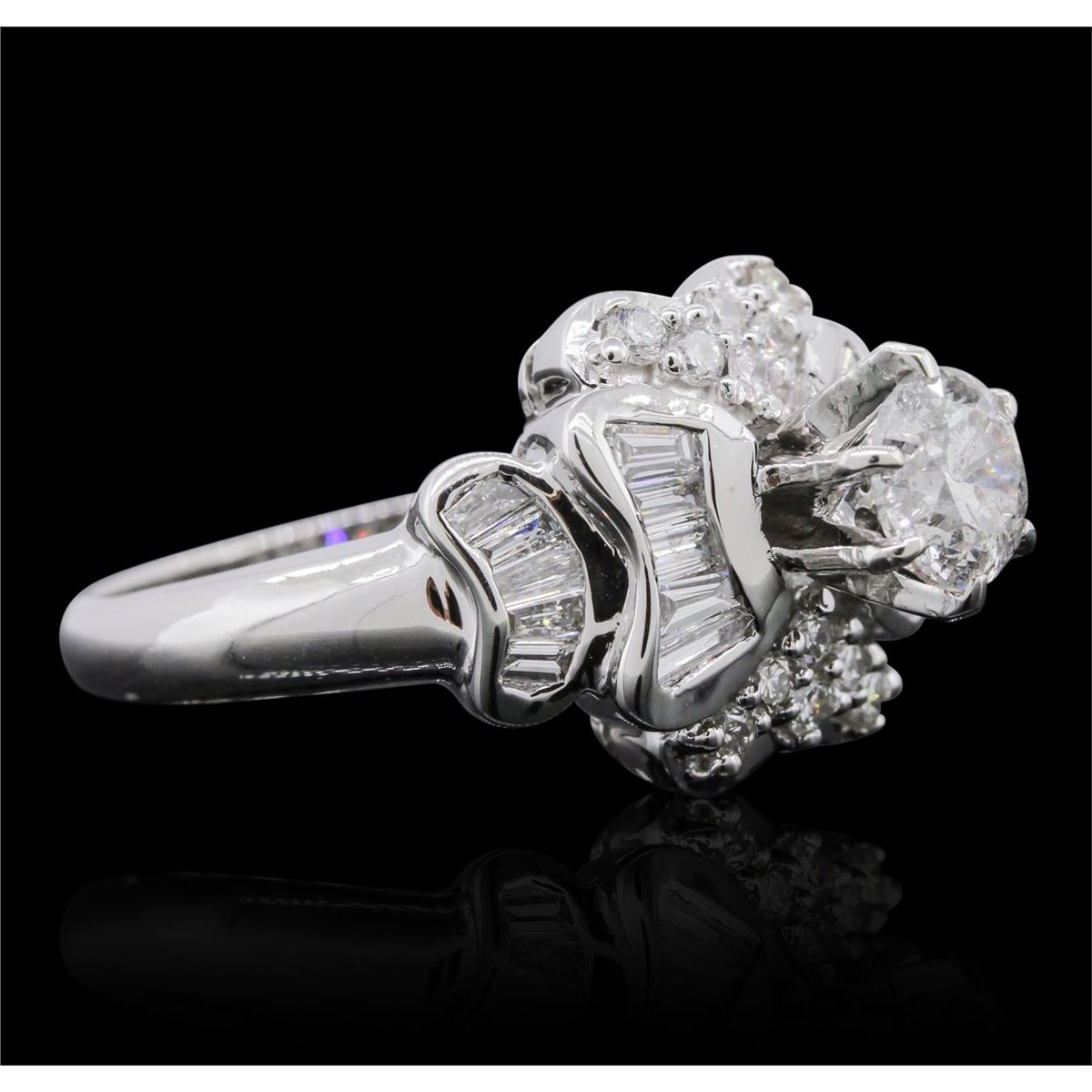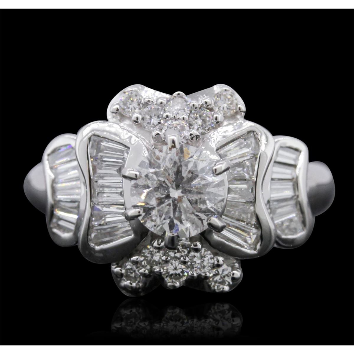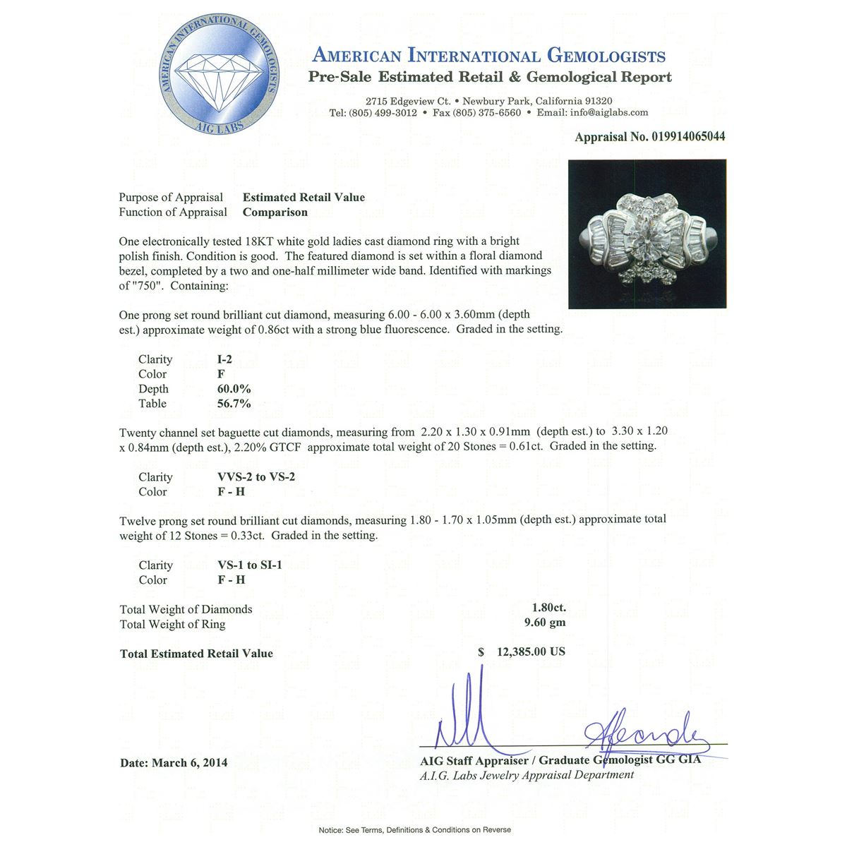 One electronically tested 18KT white gold ladies cast diamond ring with a bright polish finish. Condition is good. The featured diamond is set within a floral diamond bezel, completed by a two and one half millimeter wide band. Identified with markings of "750". Containing: One prong set round brilliant cut diamond, measuring 6.00 - 6.00 x 3.60mm (depth est.) approximate total weight of 0.86ct with a strong blue fluorescence. Graded in the setting. Clarity I-2. Color F. Depth 60.0%. Table 56.7%. Twenty channel set baguette cut diamonds, measuring from 2.20 x 1.30 x 0.91mm (depth est.) to 3.30 x 1.20 x 0.84mm (depth est.), 2.20% GTCF approximate total weight of 20 Stones = 0.61ct. Graded in the setting. Clarity VVS-2 to VS-2. Color F-H. Twelve prong set round brilliant cut diamonds, measuring 1.80 - 1.70 x 1.05mm (depth est.) approximate total weight of 12 Stones = 0.33ct. Graded in the setting. Clarity VS-1 to SI-1. Color F-H. Total Weight of Diamonds 1.80ct. Total Weight of Ring 9.60 grams. AIG Appraised at $12,385.00.