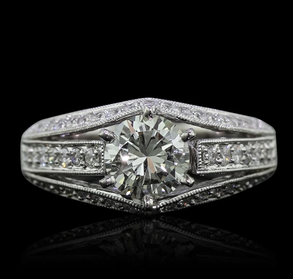 One electronically tested 18KT white gold Ladies combination cast & assembled engagement ring with a bright polish finish. Condition is new. Identified with markings of "18K". Containing: One prong set round brilliant cut diamond, measuring 6.73 - 6.65 x 4.24mm (depth est.) approximate weight of 1.16ct. Clarity: SI-1. Color: M, Cut is Very Good. Fifty-Two bead set round brilliant cut diamonds, measuring 1.50 - 1.50 x 0.90mm (depth est.) approximate. Total Weight of 52 Stones = 0.64ct. Clarity: I-1 to I-2. Color: I - J, Cut is Good. Total Weight of Diamonds 1.80ct. Total Weight of Engagement Ring 8.90 grams. GGL Appraised at $18,845.00.