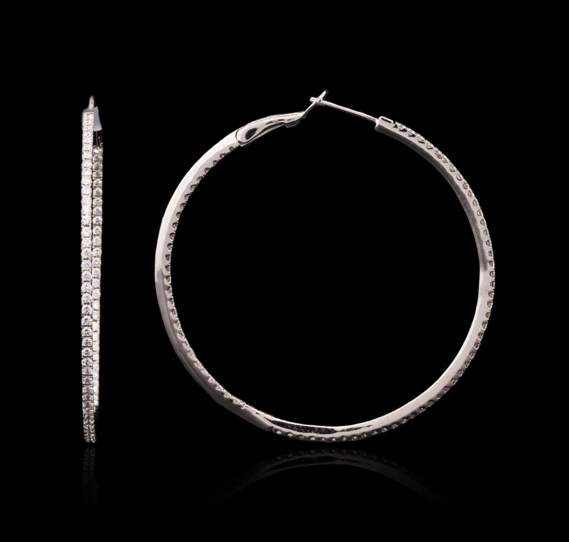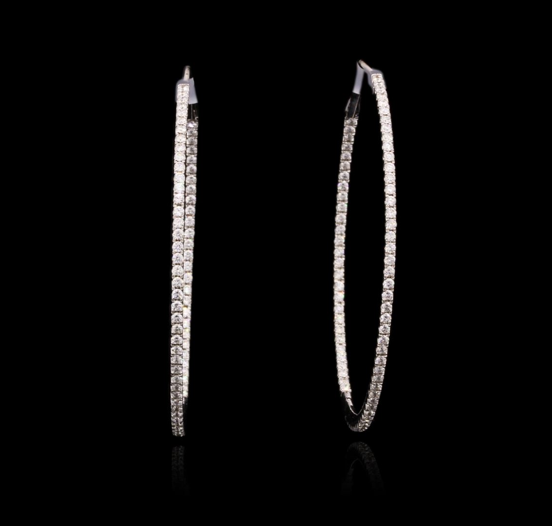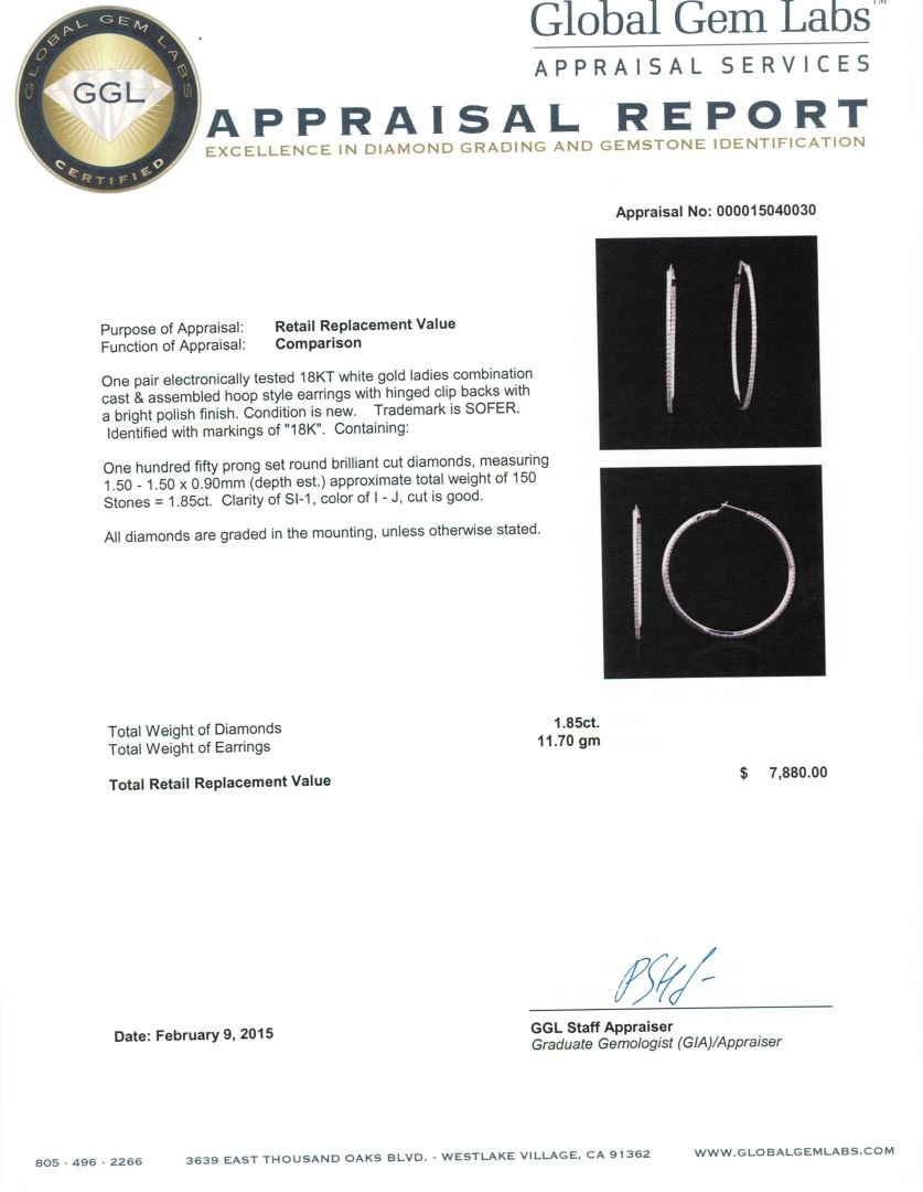 One pair electronically tested 18KT white gold ladies combination cast & assembled hoop style earrings with hinged clip backs with a bright polish finish. Trademark is SOFER. Identified with markings of "18K". Condition is new. Containing: One Hundred Fifty prong set round brilliant cut diamonds, measuring 1.50 - 1.50 x 0.90mm (depth est.) approximate total weight of 150 Stones = 1.85ct. Clarity: SI-1. Color: I - J, Cut is Good. All diamonds are graded in the mounting, unless otherwise stated. Total Weight of Diamonds 1.85ct. Total Weight of Earrings 11.70 grams. GGL Appraised at $7,880.00.