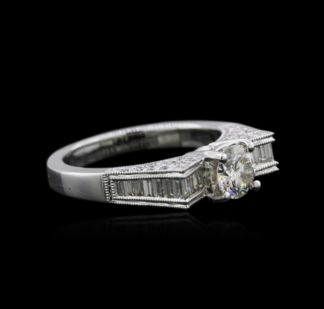 One electronically tested 18KT white gold ladies cast diamond engagement ring with a bright polish finish. Identified with markings of "18K". Condition is new. Containing: One prong set round brilliant cut diamond, measuring 5.80 - 5.80 x 3.62mm (depth est.) approximate weight of 0.74ct. Clarity: I-1. Color: K, Cut is Good. Twenty channel set baguette cut diamonds, measuring from 2.00 x 1.50 x 1.28mm (depth est.) to 2.30 x 1.50 x 1.28mm (depth est.) approximate total weight of 20 Stones = 0.75ct. Clarity: VS-1 to VS-2. Color: I - J, Cut is Good. Forty-Four prong set round brilliant cut diamonds, measuring 1.30 - 1.30 x 0.78mm (depth est.) approximate total weight of 44 Stones = 0.35ct. Clarity: SI-1. Color: H - I, Cut is Good. All diamonds are graded in the mounting, unless otherwise stated. Total Weight of Diamonds 1.85ct. Total Weight of Engagement Ring 5.80 grams. GGL Appraised at $7,115.00.